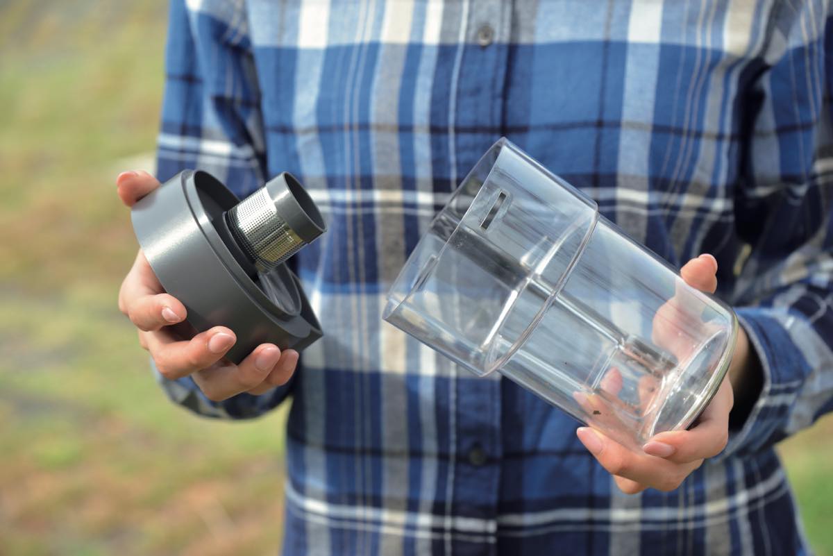 ▲先端のダストケースを外してゴミを捨てる。フィルターは水洗いすれば清潔