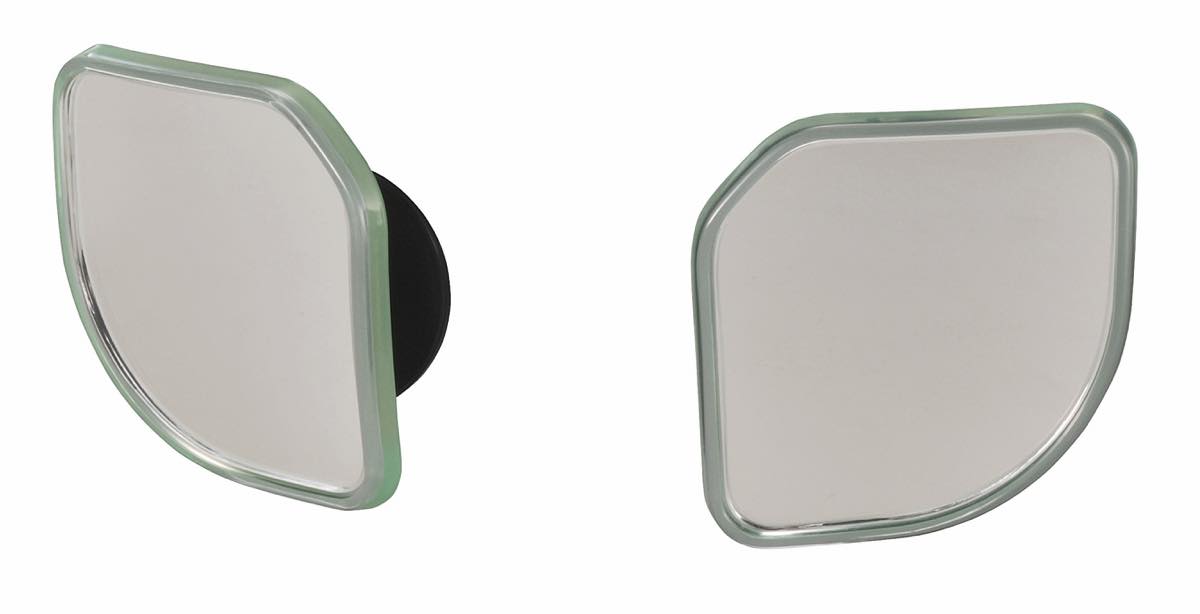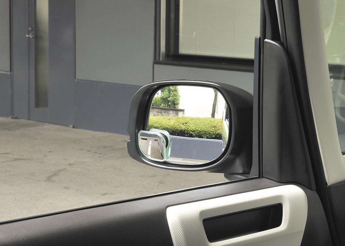 サイドミラーの端に両面テープで装着すると、曲面鏡により左下の死角を映し出す。下の白線、縁石、側溝などが見えるため、バックで車庫入れするときに助けとなる。扇型タイプのほか、ワイドタイプも用意。