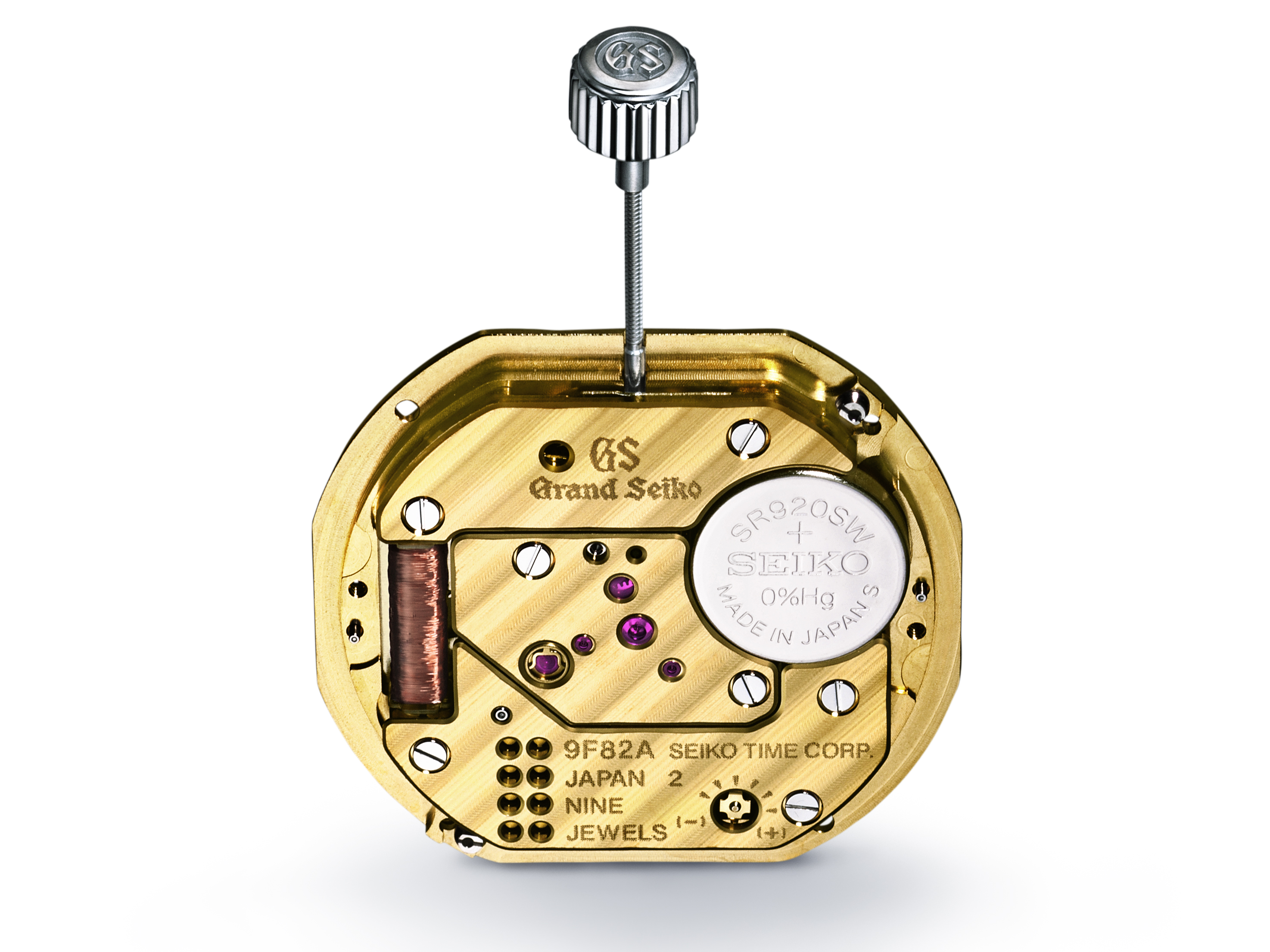 2018年に誕生25周年を迎えた自社製のCal.9Fを搭載。このムーブメントは、グランドセイコーらしい太くて長い針や瞬間的に切り替わる大型カレンダーなど、従来のクオーツムーブメントでは不可能とされる要素を実現させた“究極”のクオーツムーブメントであり、圧倒的な高精度と機械式時計と同等の高級感を両立させた。