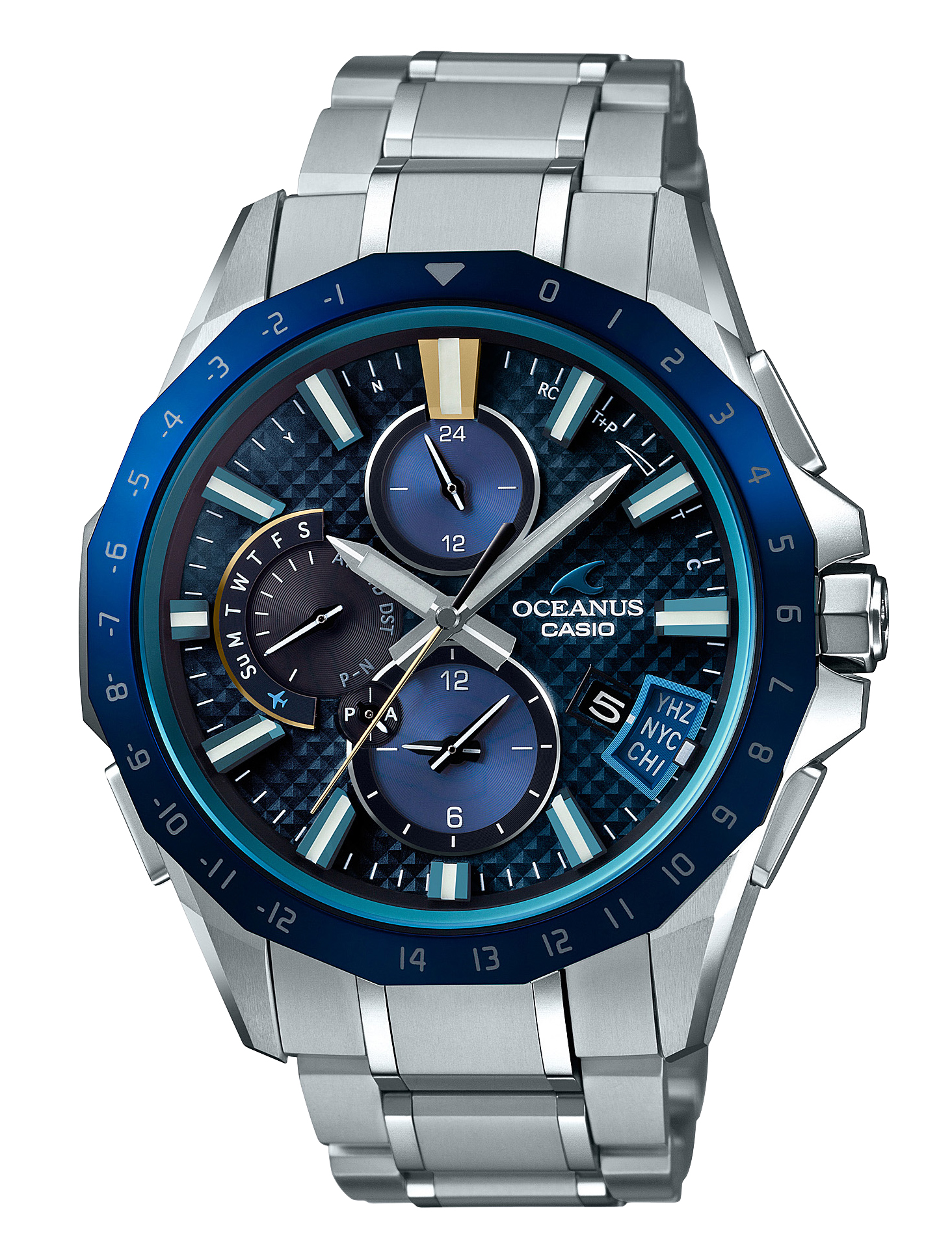 その新作「OCW-G2000RA-1AJF」は、ダイヤルの造作にも注目して欲しい。ダイヤル仕上げに制約が多い光発電式ながら、美しいブルーの「クルー ド パリ装飾」を施している。