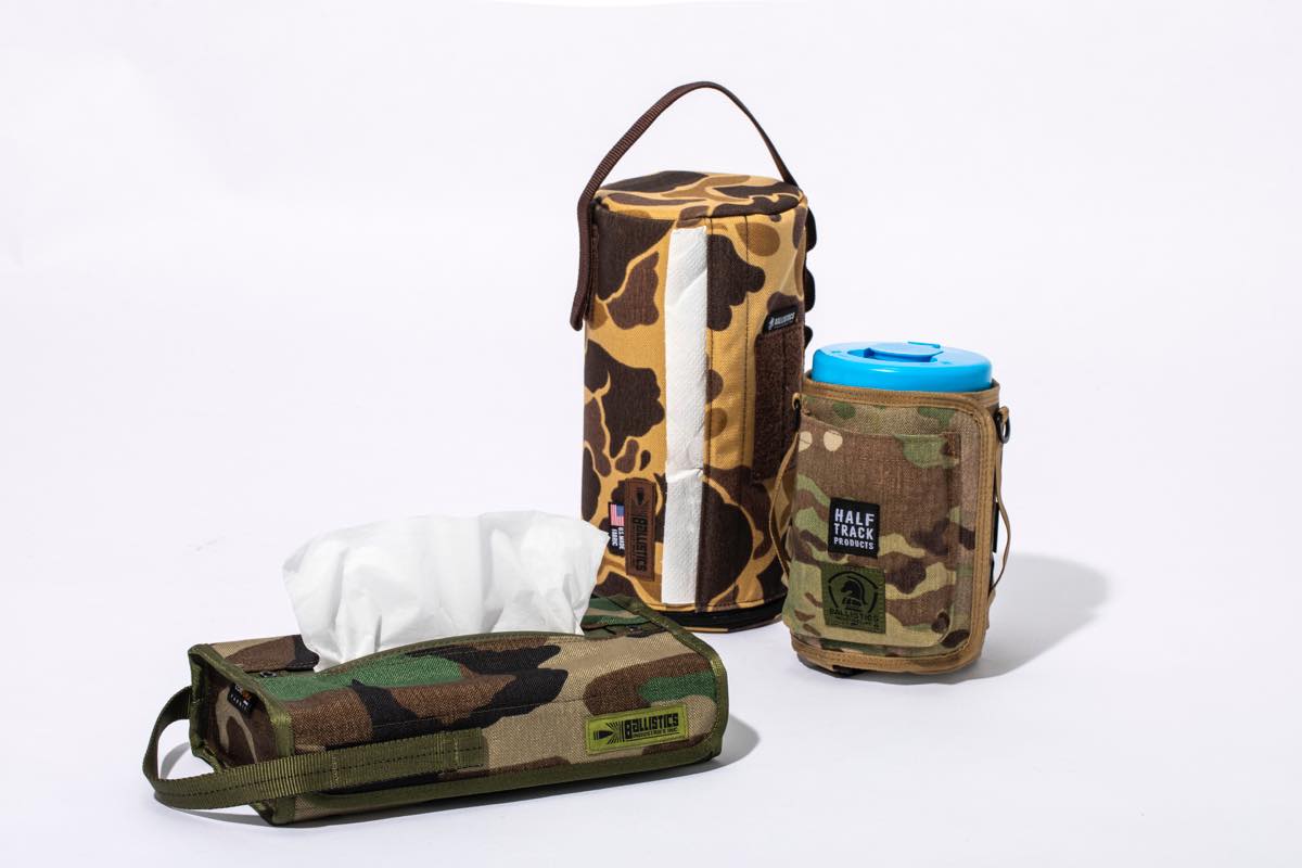 ▲左から「TISSUE CASE」「MILITARY KITCHEN PAPER CASE」「WET TISSUE COVER」