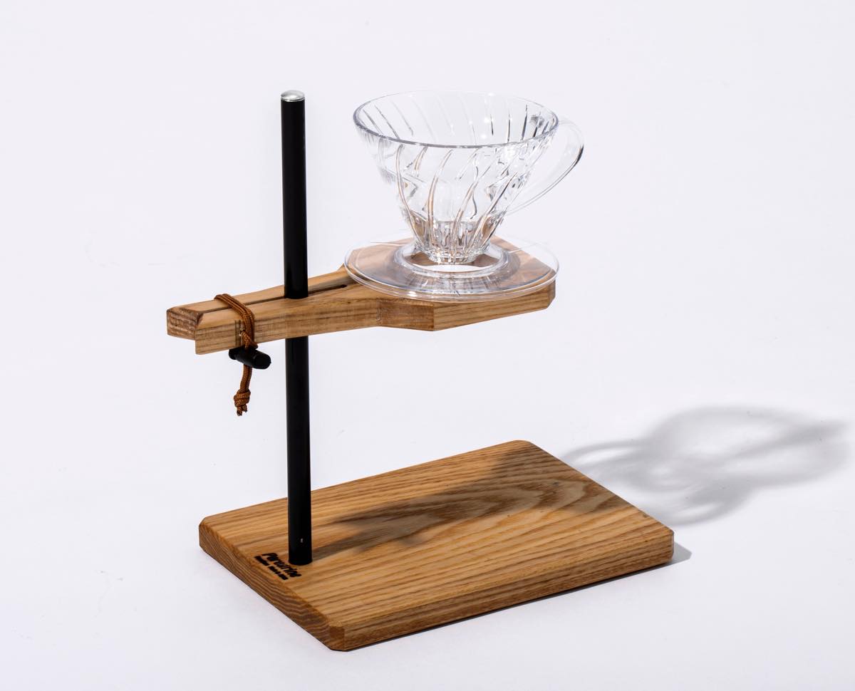 無垢のタモ材とジュラルミン製テントポールを使用したコーヒードリップスタンド。商品名の通り、ドリップヘッドはキツツキのように上下左右に動かして自在に調整可能。21cmの高さまで対応するので、マグカップや水筒などにドリップできる。専用の収納袋付き。ベースプレートのサイズはW19×H14×D1.5cm