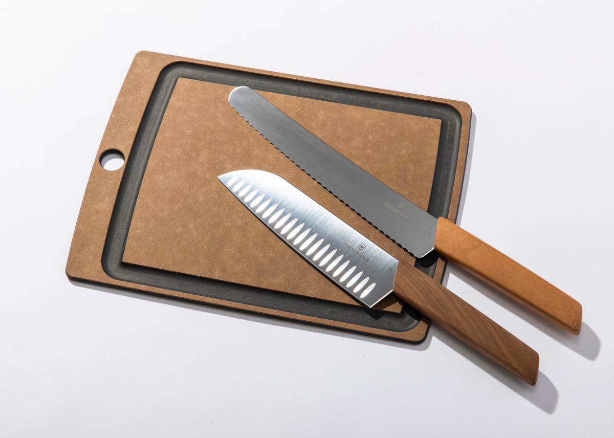 木目の美しいウォールナット製ハンドルを採用した、スイスモダンコレクションのナイフ2種。三徳包丁は17cmの溝付き刃で、切った食材がブレードに付着しにくいのが特徴。刃渡り22cmのパン切り包丁は、パンや焼き菓子のほか皮の硬い野菜を切るときにも便利。そして環境に配慮したウッドファイバー製カッティングボードは、ブレードにやさしく熱に強い。W29×22.9×D0.7cm