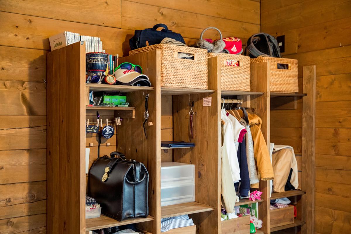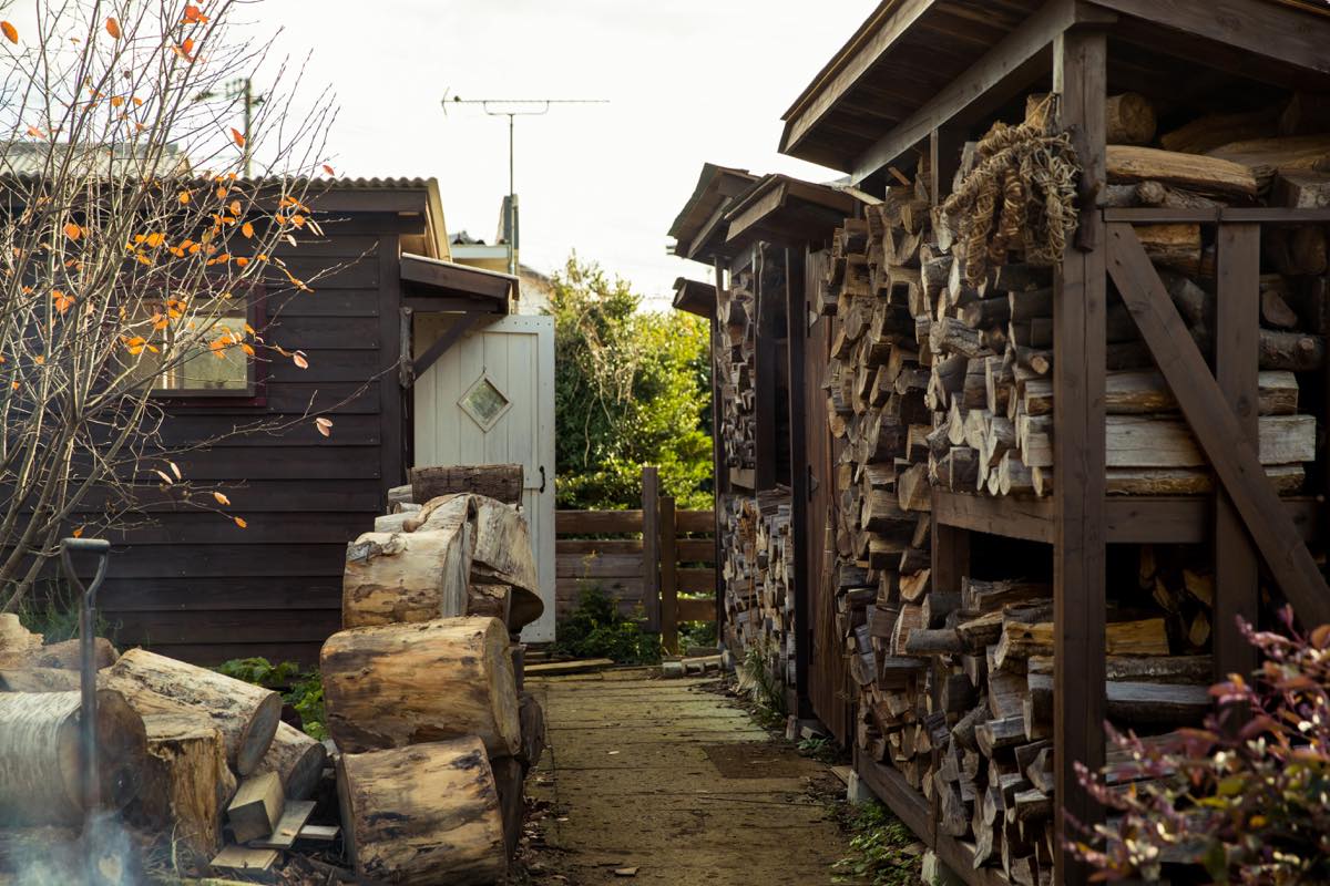 ▲薪となる木は知り合いから譲ってもらったり、仲間とチェーンソーを担いで集めに行ったりして確保。薪割りは自身で行い、なんと薪棚も自作したそうだ
