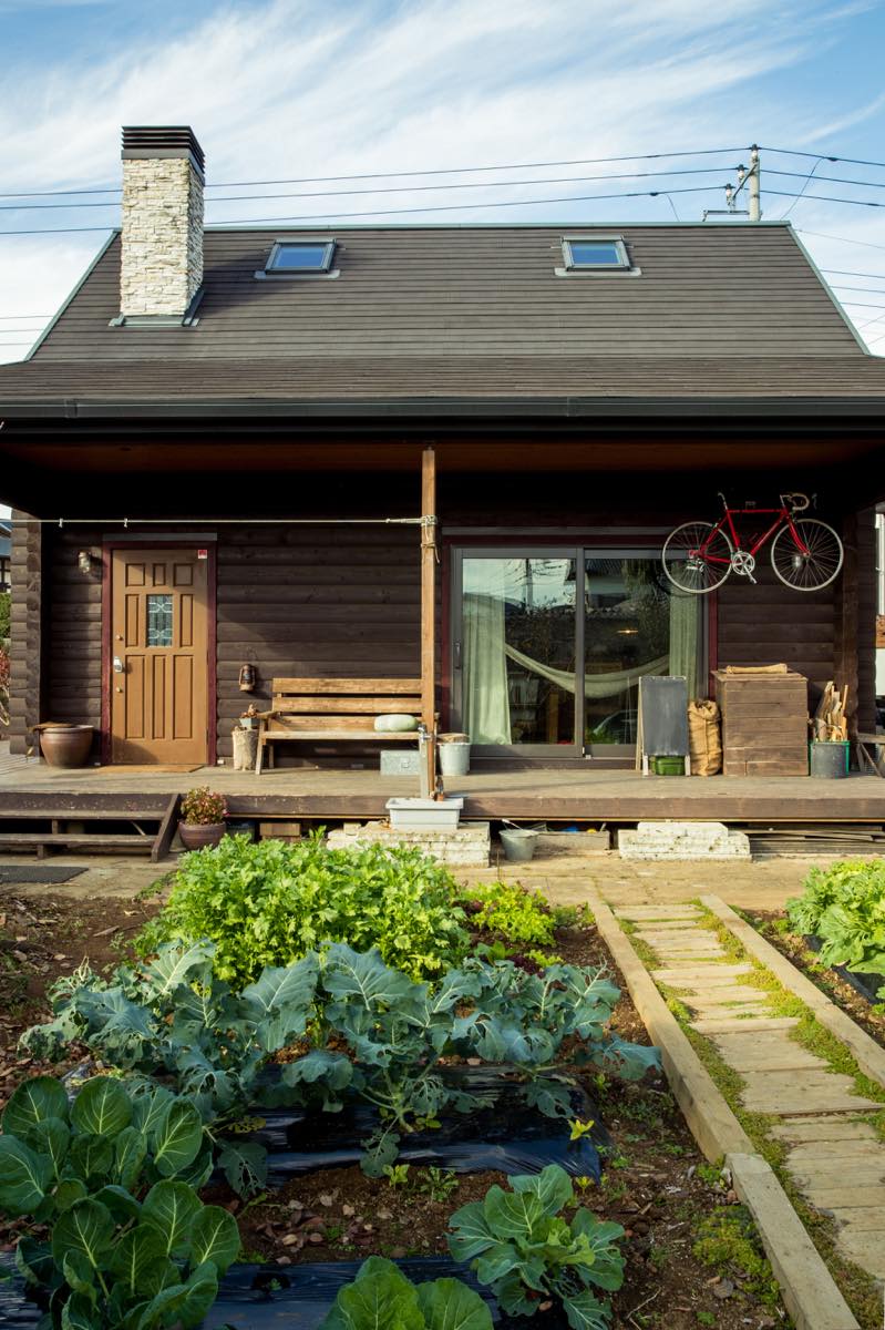 ▲あえて道路に面して玄関を設けず、ウッドデッキを中心としたプライベート空間が広がる家に。庭のほとんどを家庭菜園にしている