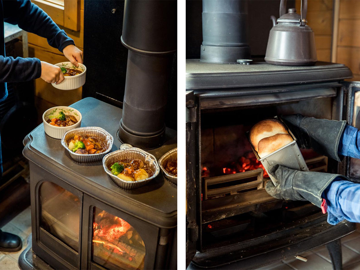 ▲薪ストーブでパンを焼き、煮込みハンバーグの仕上げも薪ストーブで。料理にも薪ストーブが大活躍!