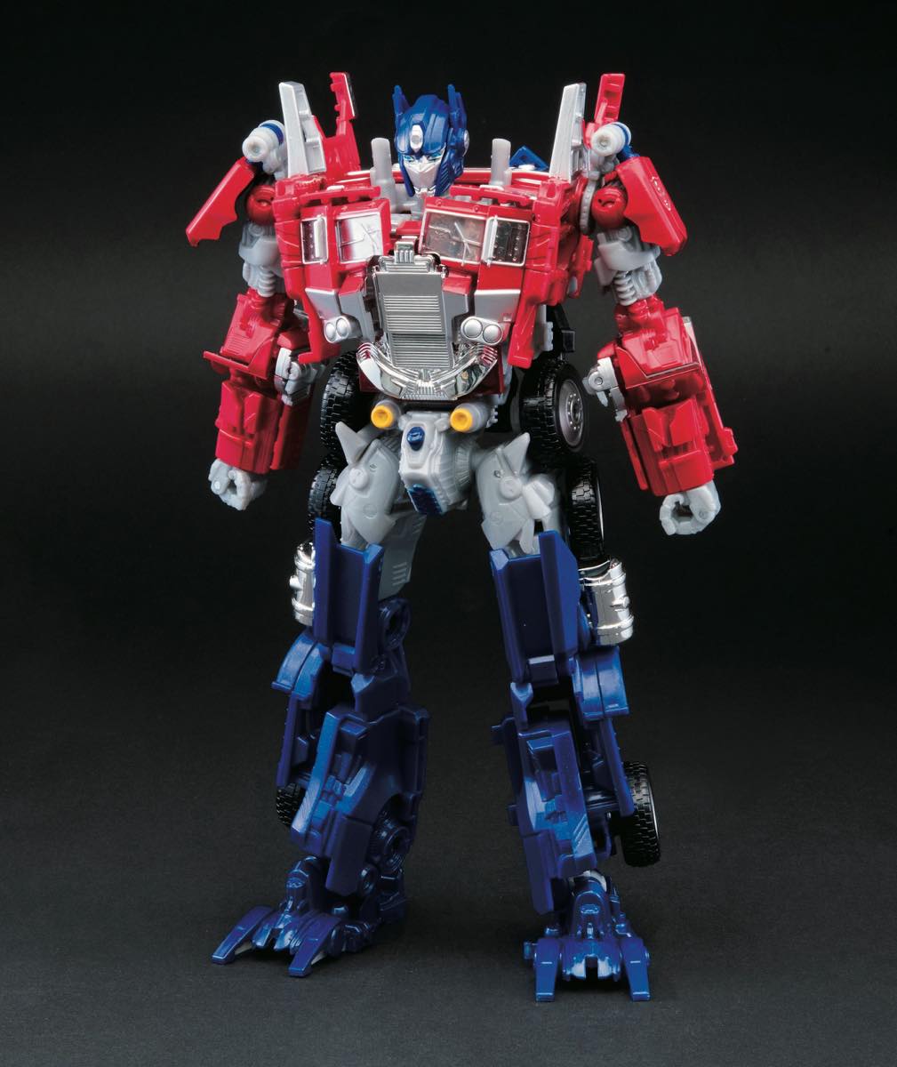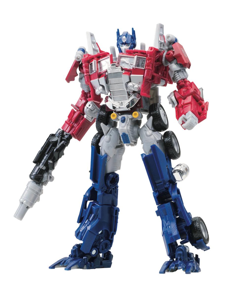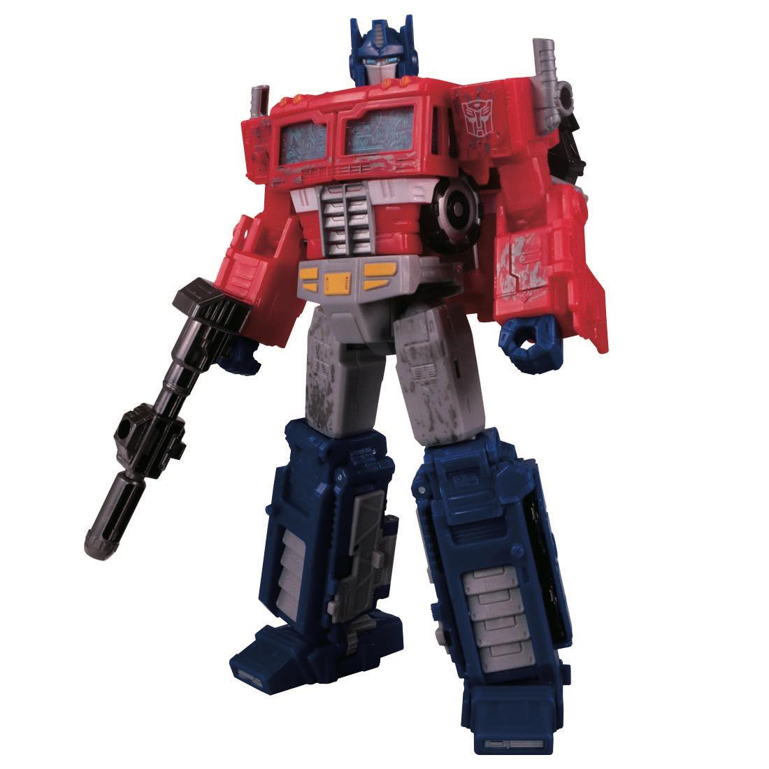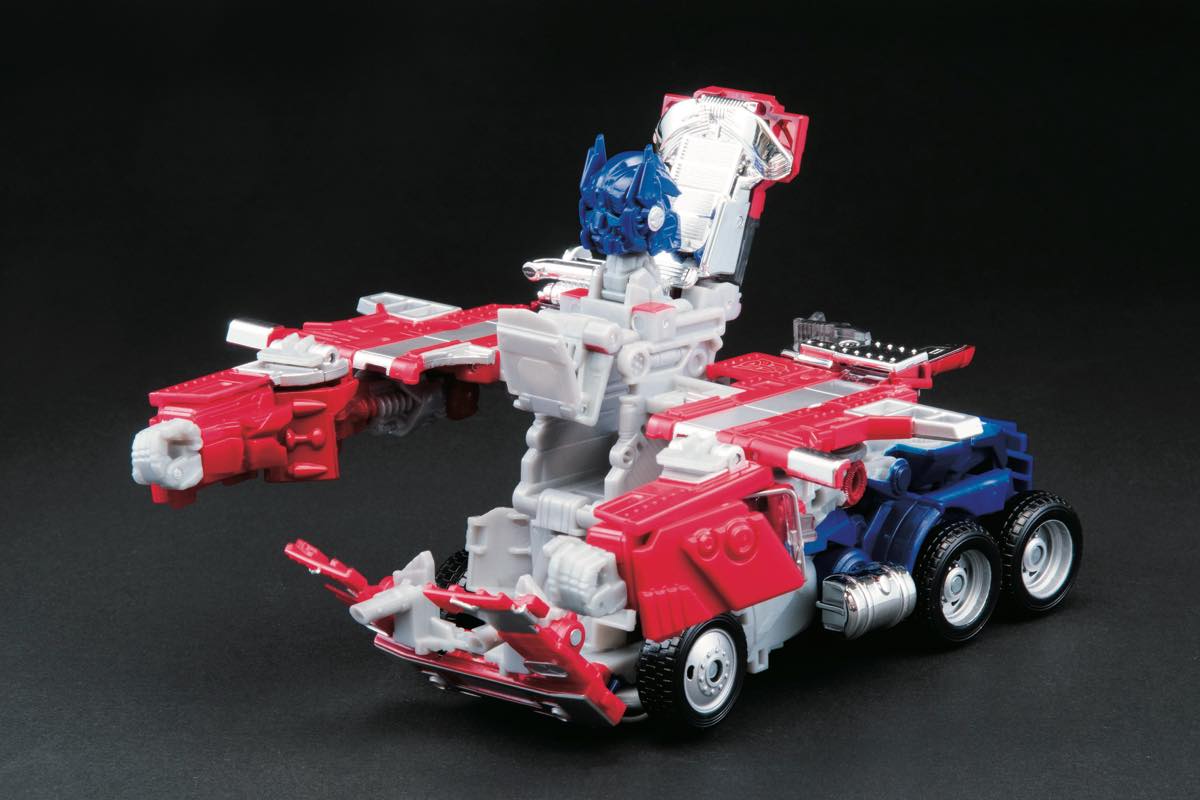 胸部や腕にウェザリングされたオプティマスプライム。ビークルモードでは車輪位置を変えることにより、ホバーモードにもなる。武器パーツは銃と斧が付属。全高約17cm
