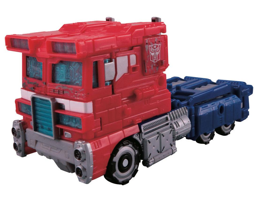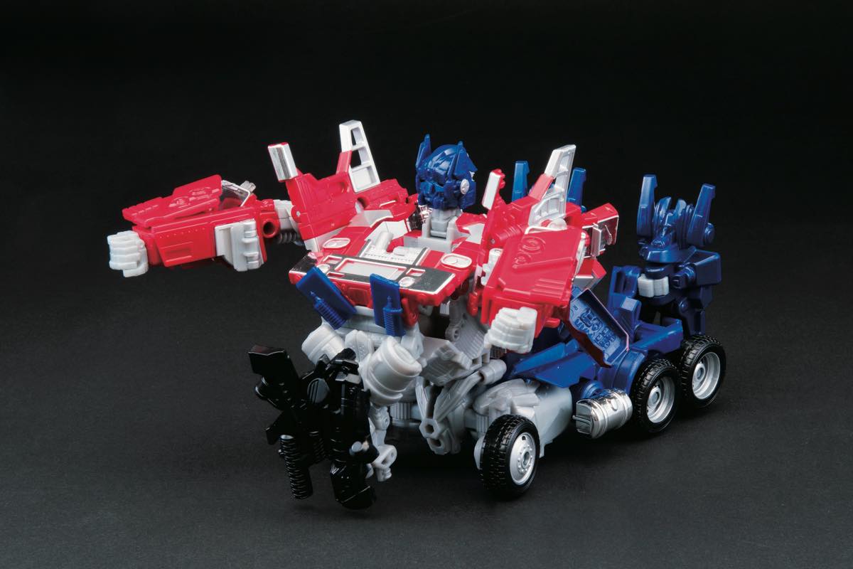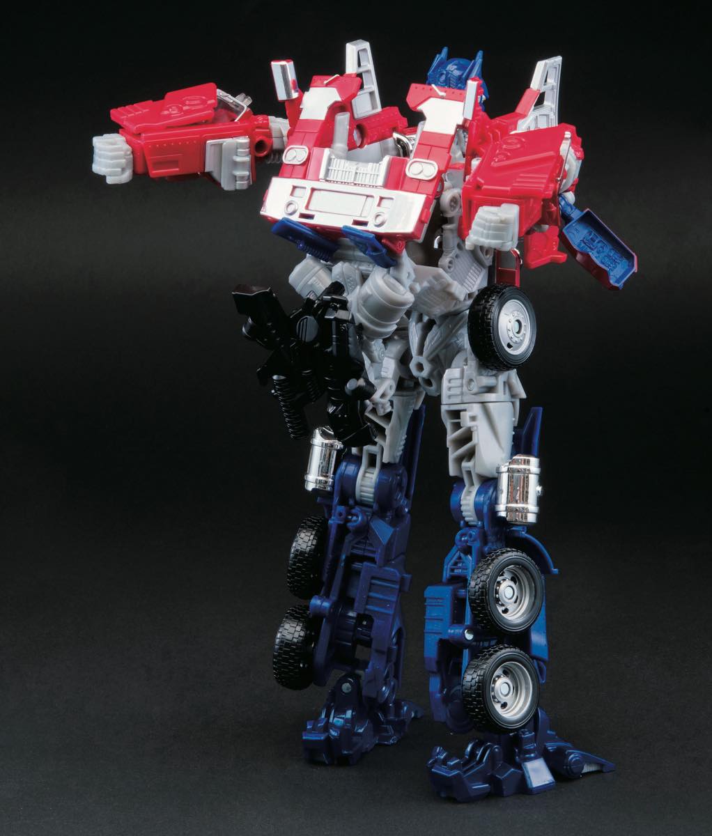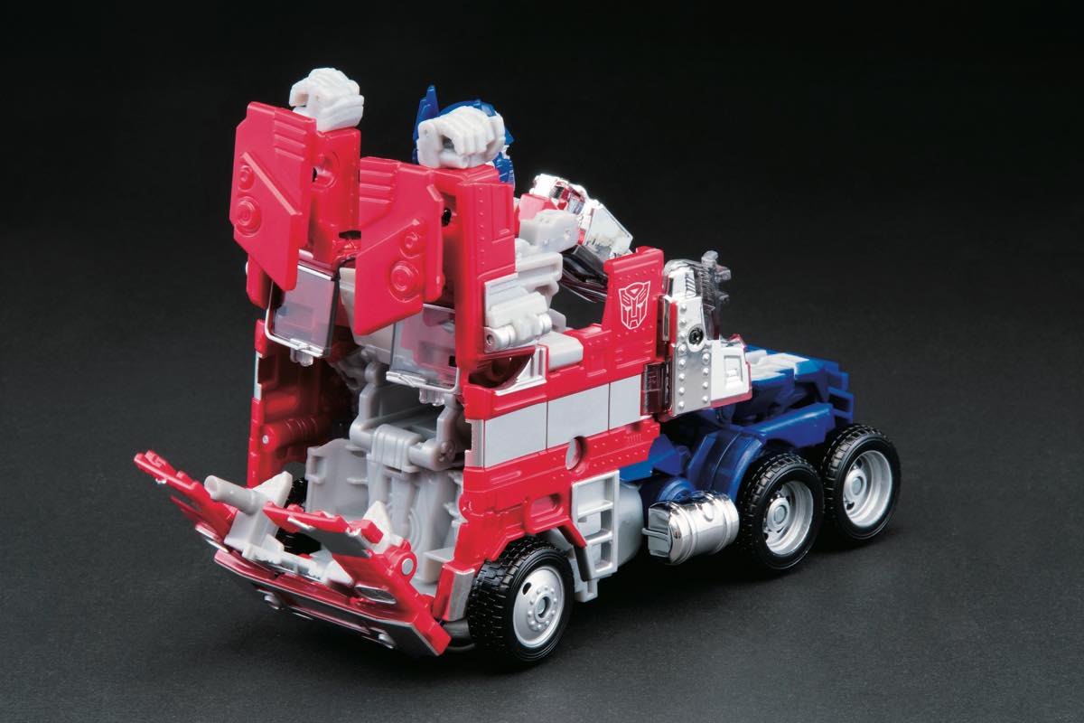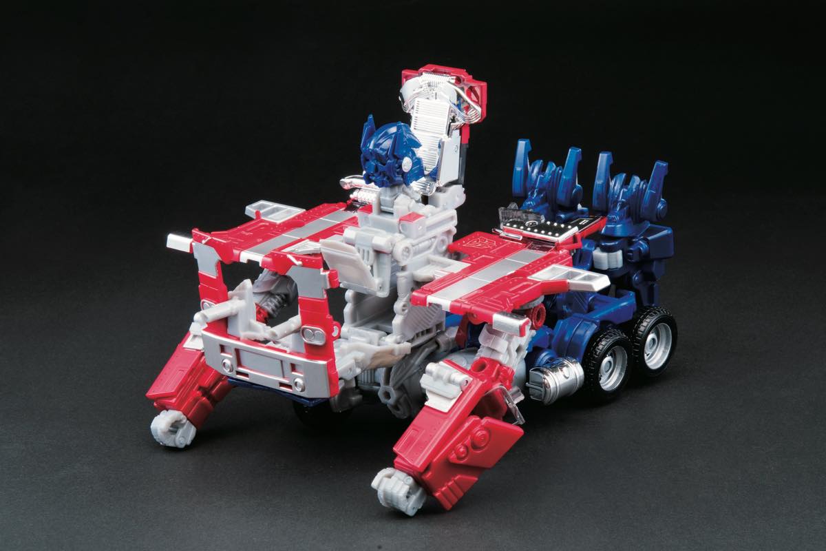 胸部や腕にウェザリングされたオプティマスプライム。ビークルモードでは車輪位置を変えることにより、ホバーモードにもなる。武器パーツは銃と斧が付属。全高約17cm