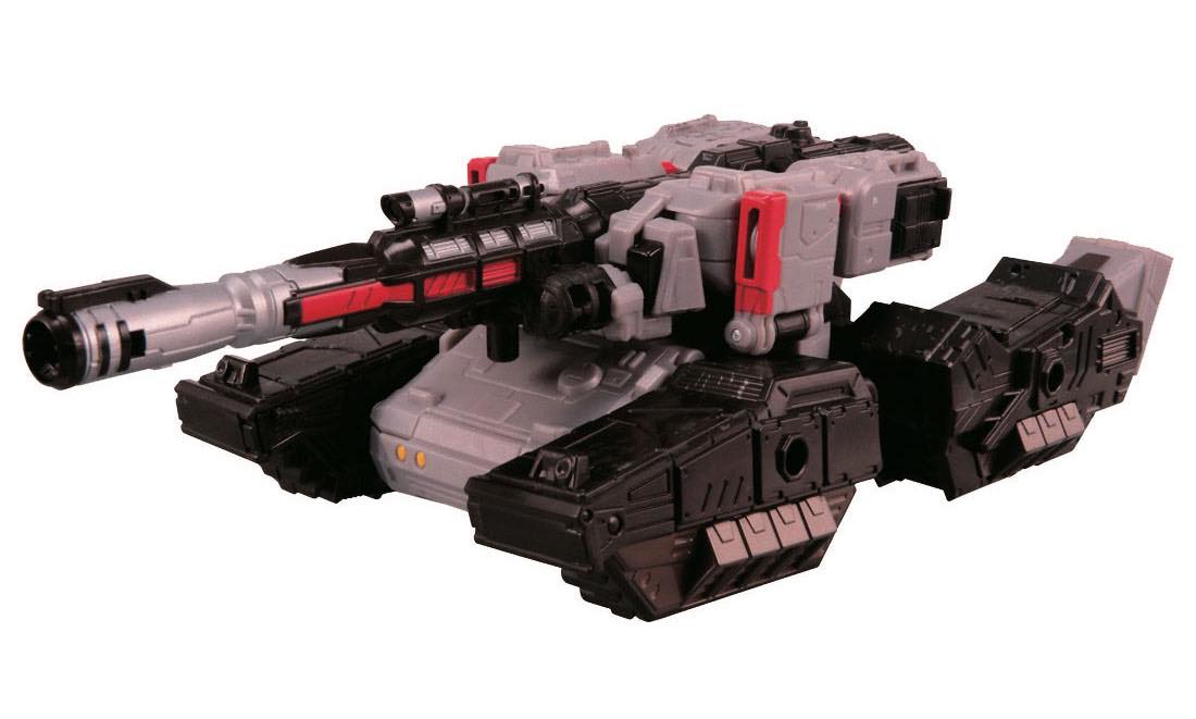 オプティマスプライムの宿敵メガトロン。ビークルモードとして、23cmの巨大な戦車形態に変形可能だ。戦車形態の際にも付属の銃型と剣型の武器が合体する仕組み。全高約17cm