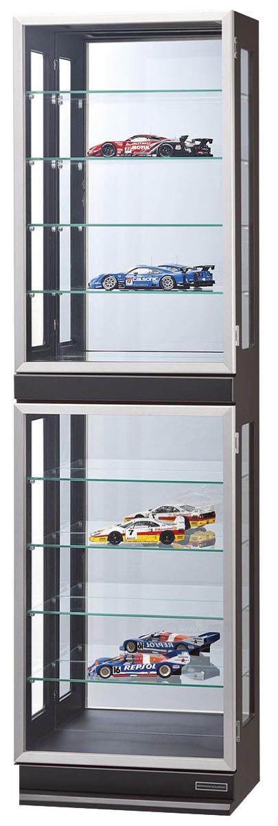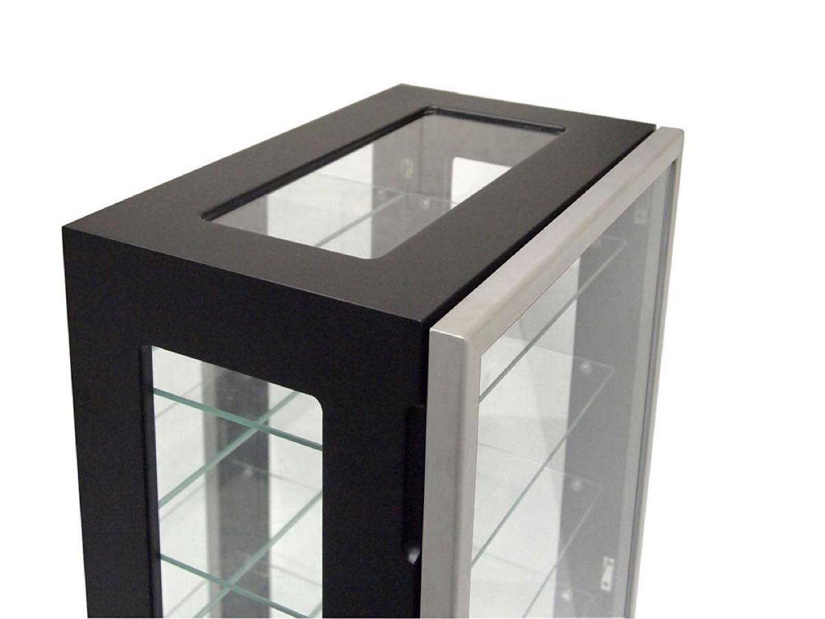 ブラックのMDF素材とアルミフレーム、強化ガラスを使用し、格調高い雰囲気に仕上げたディスプレイケース。ガラス製の棚板は位置を調節できるので、幅広いコレクションに利用できる。