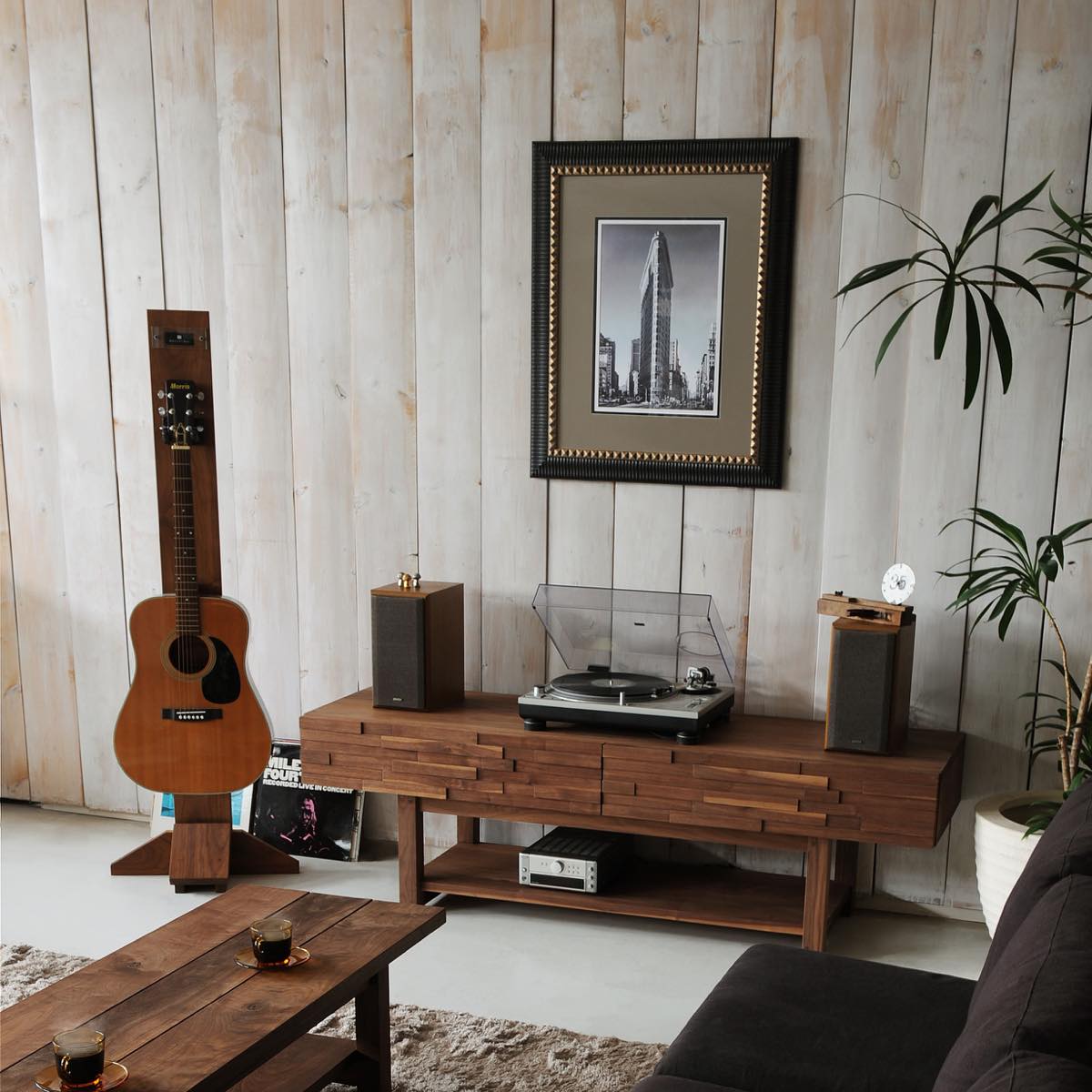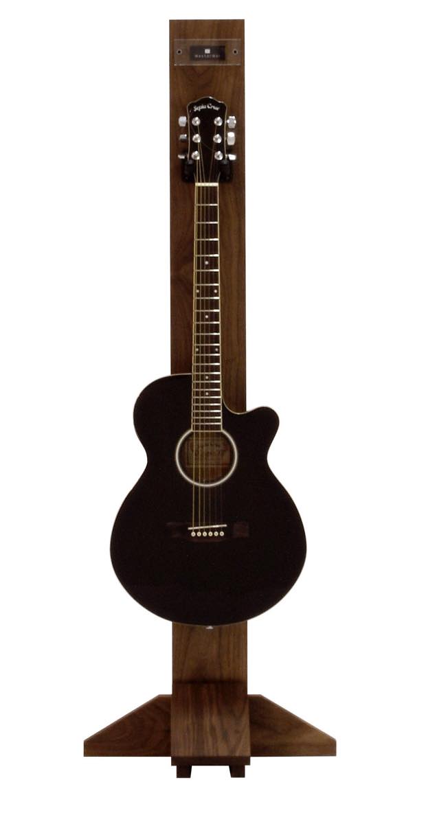 無垢材を使用したギター用ディスプレイスタンド。シンプルながらインテリアに馴染むデザインで、愛着のある1本を手軽に飾れる。フック部分はプロテクターで覆われていて、ネックの傷つきを防ぐ。