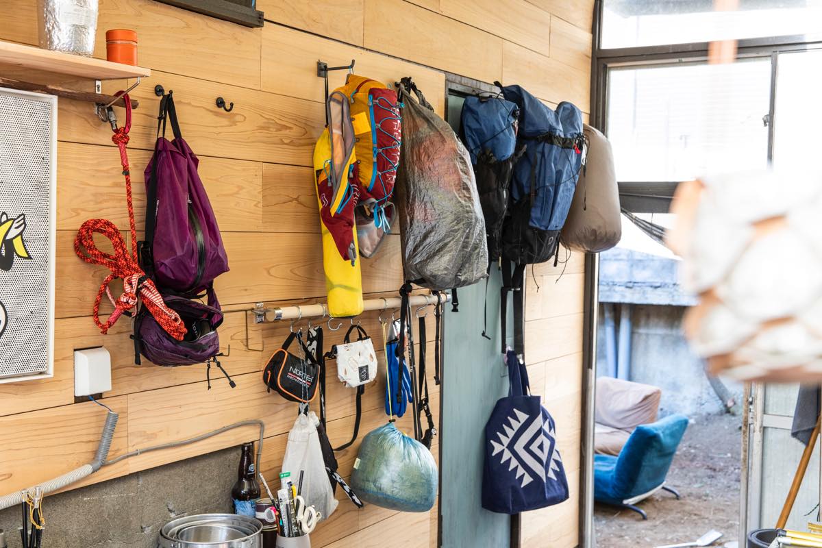 ▲ほとんどのアウトドアギアは、居住スペースとアトリエの間にある通路部分に収納。ウルトラライトに傾倒し、厳選したモノだけを所有するミニマル至高というだけあって、その絶対数は少なめだ