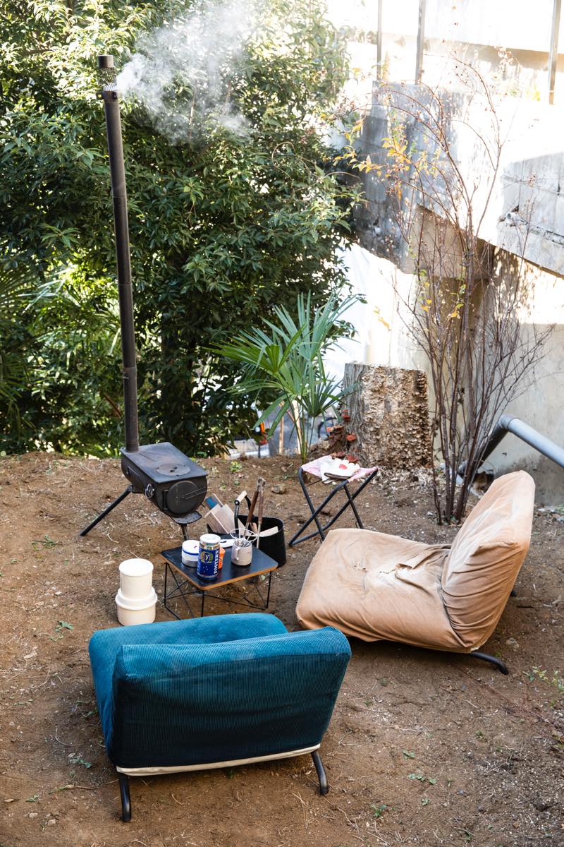 ▲ジャングルなみに生い茂っていた敷地内のデッドスペースを、年単位の時間をかけて自ら開墾。薪ストーブとソファを持ち込み、焚き火ができる裏庭へと変身させた。さらに今後は、ここをDIYでウッドデッキ化したいとのこと