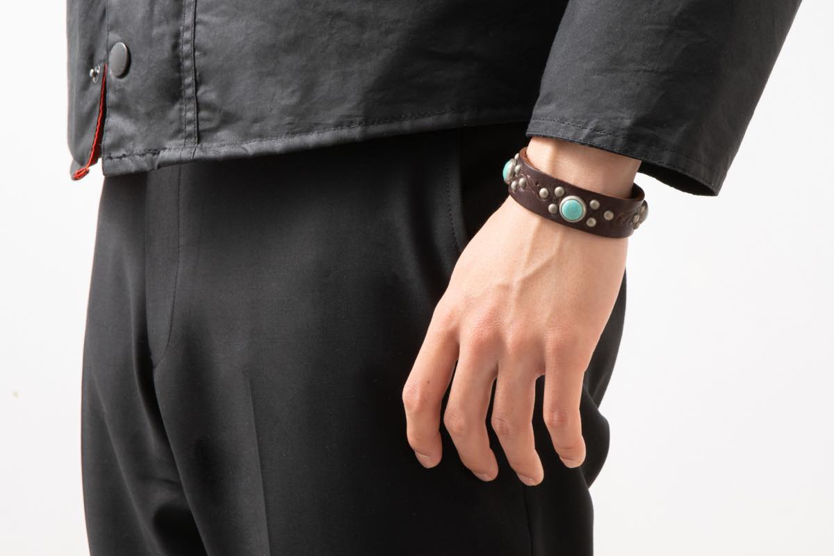 ヴィンテージのベルトにオリジナルスタッズを手作業で打ち込み、1930~50年代に作られていたとされるスタッズベルトを再現。ここからスタートしたHTCの革小物は世界中で愛される。ターコイズ入りのバングルは腕元のアクセントに最適。