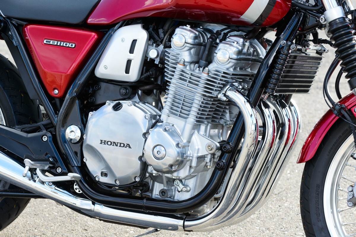 空冷の1100ccエンジンを積むのが「CB1100」。空冷エンジンらしいドロドロという排気音と重厚な加速感が持ち味です。現代の排気ガス規制に対応しながら、安定した性能を発揮するためにヘッド周りにオイルを潤滑させる複雑な機構を採用。写真はクラシカルなイメージを強調する18インチのスポークホイールを採用した「CB1100EX」。現代的な17インチホイールを装備した「CB1100RS」というモデルも選べます。「CBはやはり空冷でなきゃ」というこだわり派にオススメのモデルです。