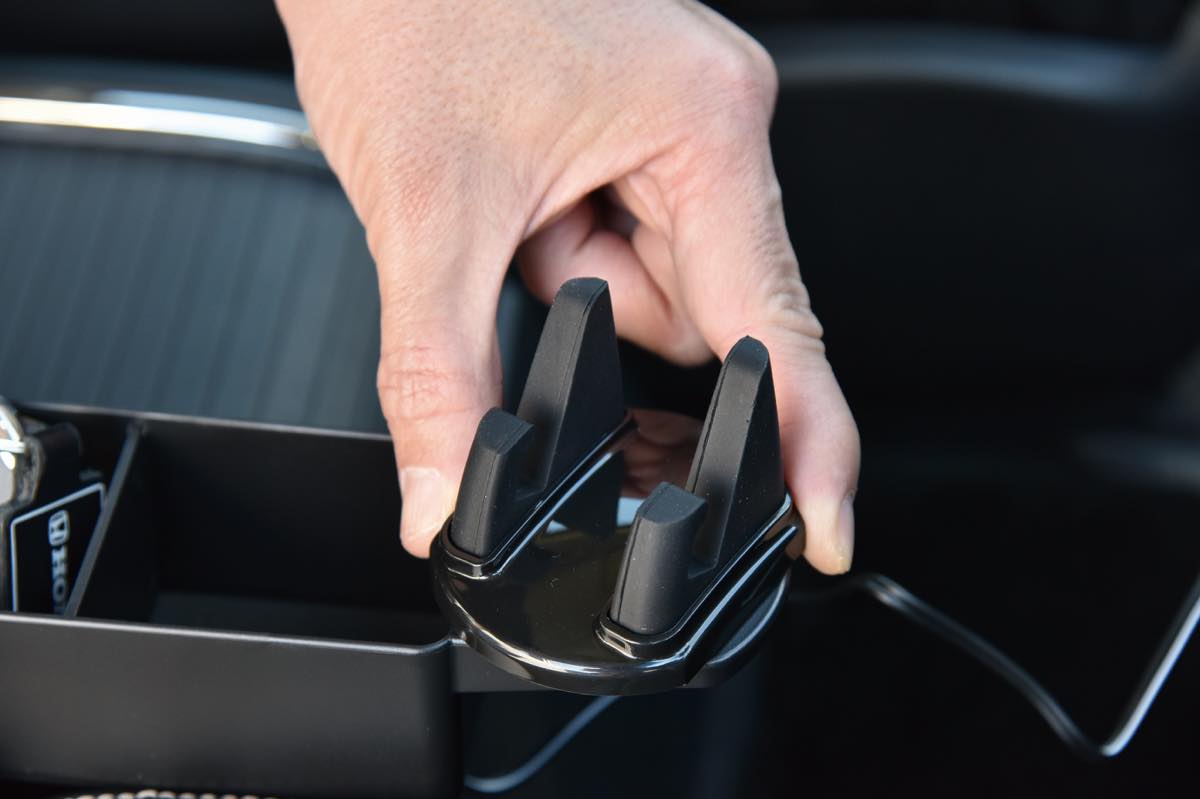 ▲ホルダー部分が後ろ側になるようにして差し込むと、リヤシート用のスマホホルダーにもなる。前後の差し替えはとても簡単
