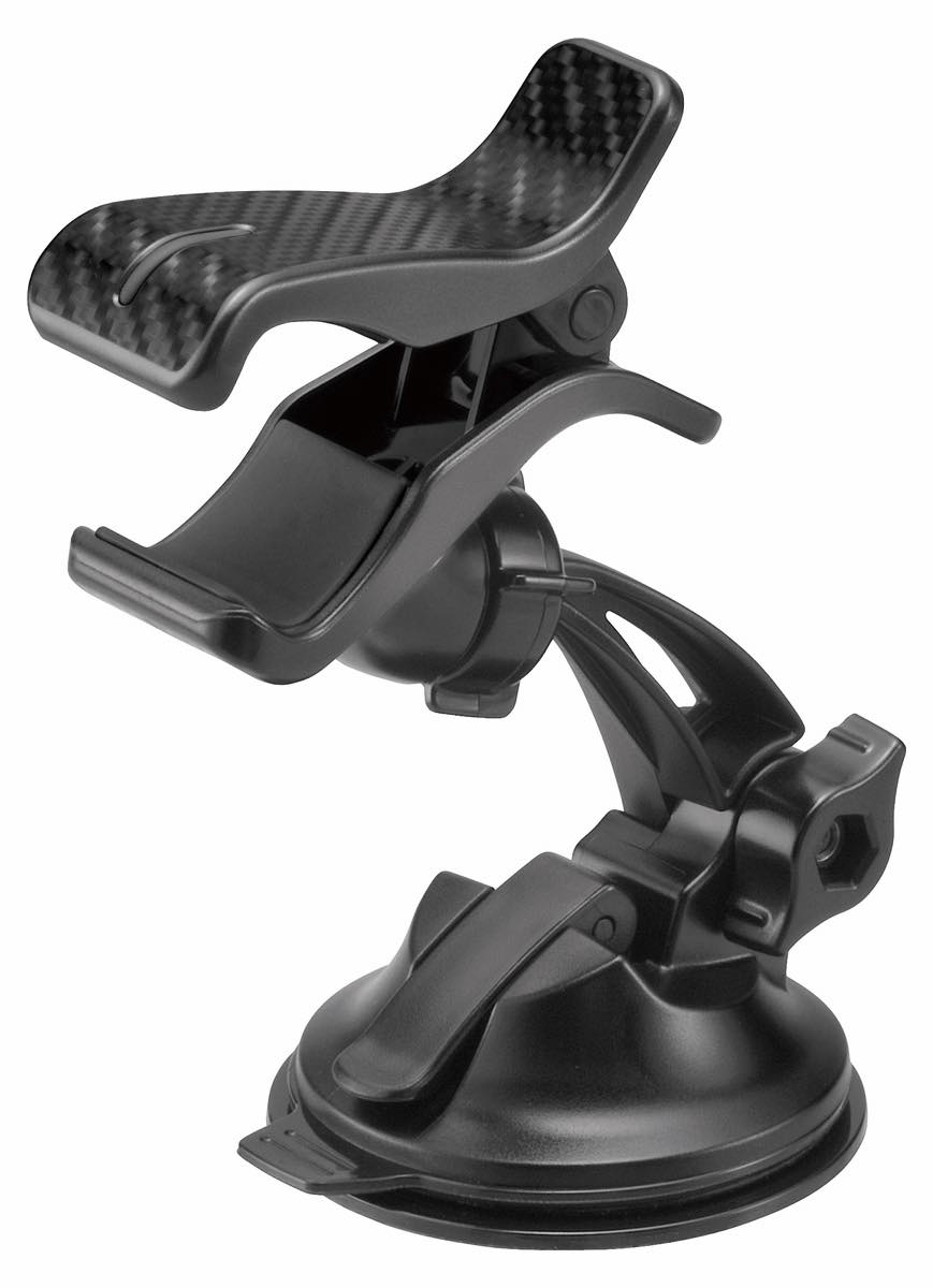 幅50〜100mm、重量200g以下のスマホに対応しており、クリップ式で挟み込むタイプ。カーボン調のスタイリッシュなデザインで、底部の吸盤はしっかり密着できる。