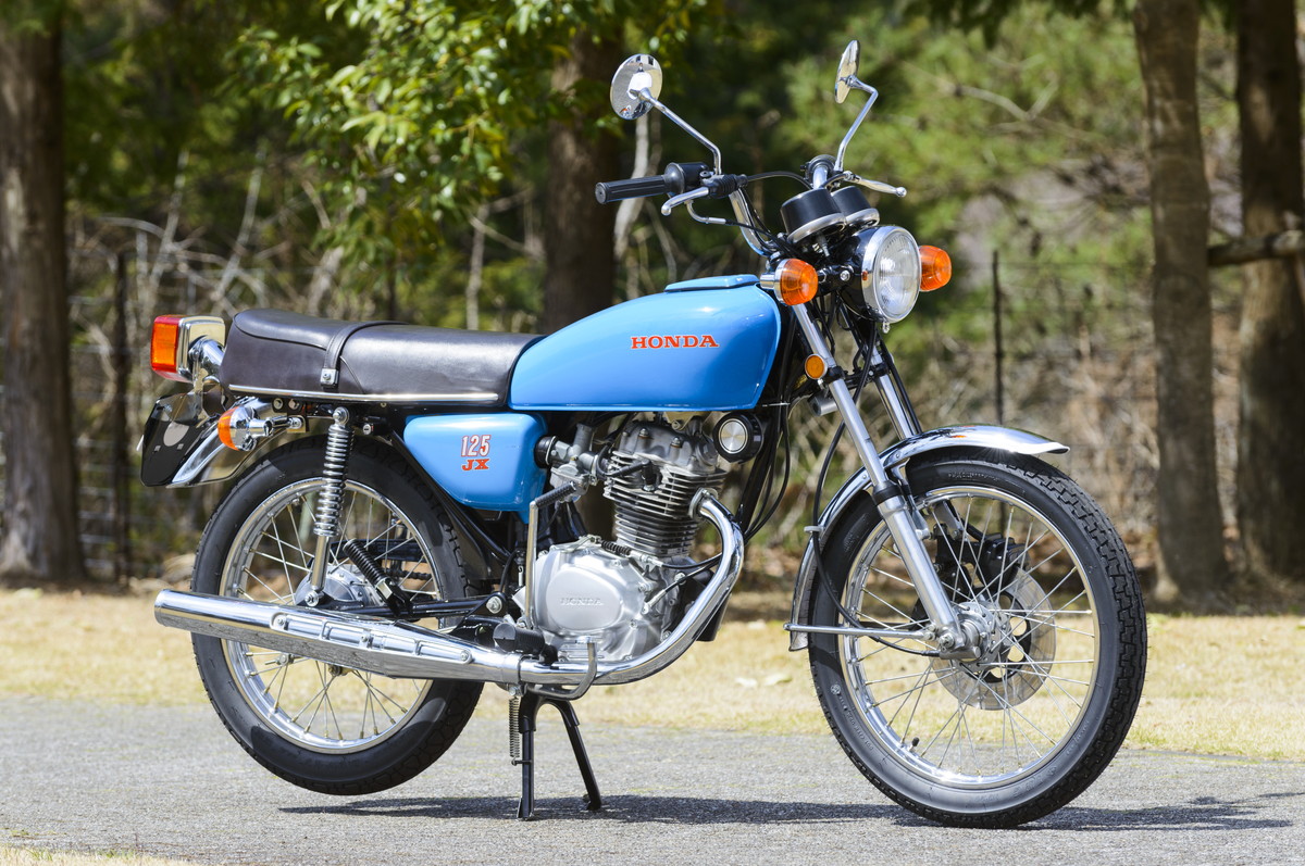 「CB90」の後を継ぐかたちで1975年に発売されたのが「ベンリィCB125JX」です。直立したシリンダーのエンジンにティアドロップ型のタンクというバイクらしいスタイリングにCBシリーズらしさを感じます。最高出力は14馬力/10000rpmにまで引き上げられており、それに合わせて機械式のディスクブレーキを装備しています。