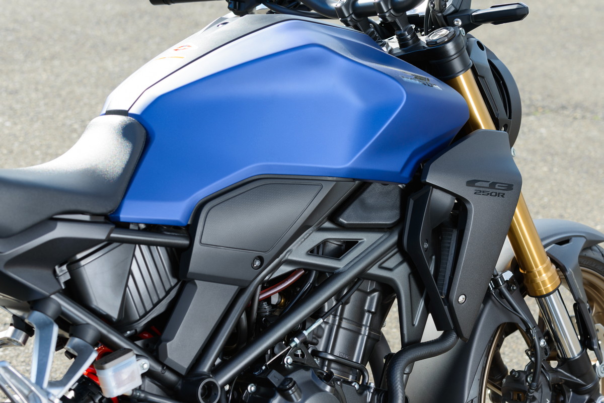 ラジエーターを支えるシュラウドへとつながるような立体感を強調したタンクの造形も、兄弟モデルと共通するもの。急制動時にリアタイヤの浮き上がりを抑制する車体姿勢推定システム付きのABSを標準装備するなど、小排気量車であっても手を抜いていない作り込みが感じられます。