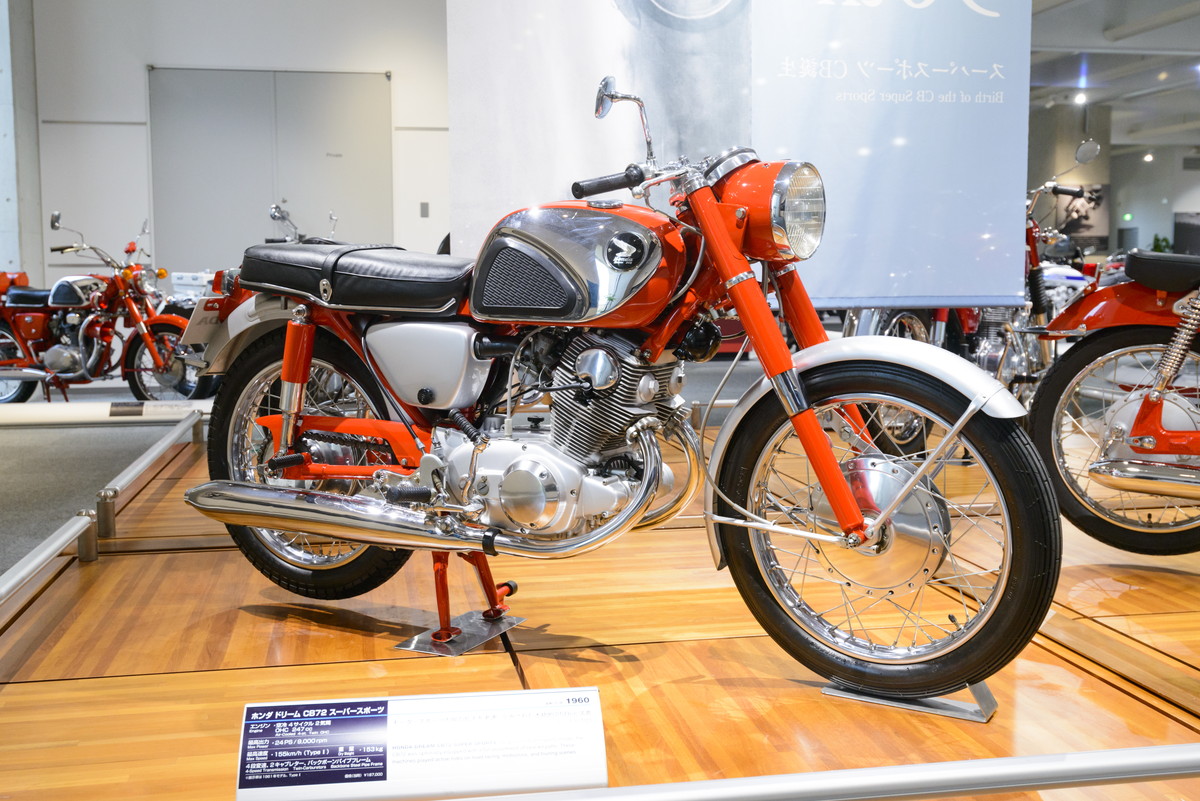 続いてCBシリーズの歴史に名を残した1960年発売の「ドリームCB72スーパースポーツ」も250ccモデル。こちらは2気筒エンジンで、24馬力を9000rpmで発生させていました。この時代に1リッターあたりほぼ100馬力を達成し、現行モデルと最高出力や発生する回転数がほとんど変わらないのも驚異的です。