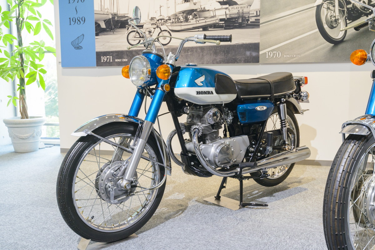 そしてこの写真は1969年式の「ベンリィCB125」。当時の上位モデルである「CB250」「CB350」と同じ2気筒エンジンを搭載し、5速ミッションやタコメーターも装備するなど小排気量であっても手を抜いていないことが感じられます。ちなみにエンジンは15馬力を11000rpmで発揮していました。