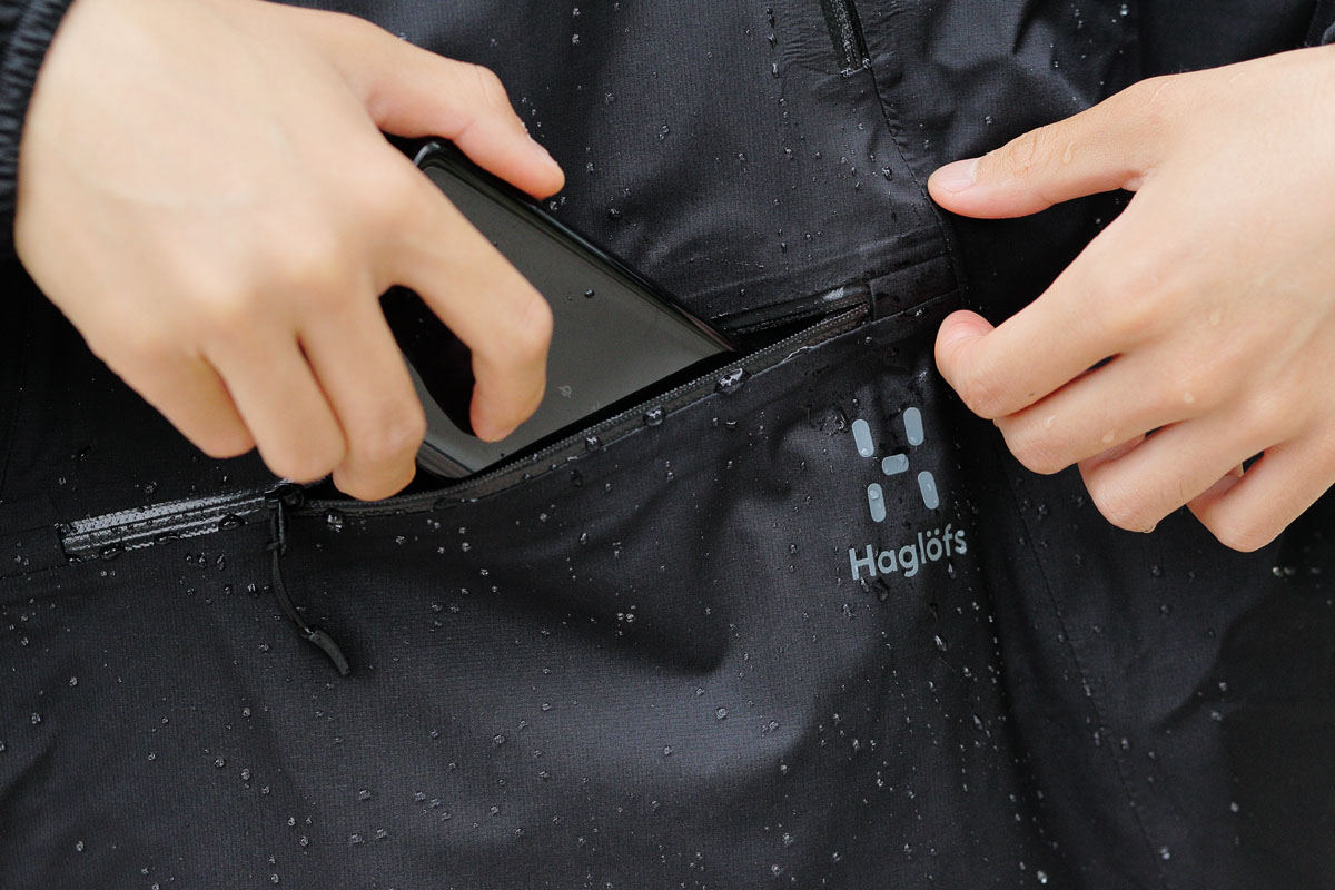 ▲フロントに大きなポケット付き。財布やスマホなどの貴重品も濡らさずに取り出せる