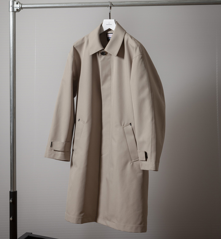 撥水加工を施したオリジナルのスリーレイヤー生地を使用したステンカラーのレインコート。透湿性も高く、縫い目にはシームテープを施すなどレインウェア顔負けのスペックです。人間の動きを考慮した独自の立体パターンは“美シルエット”を実現し、着心地にストレスを感じさせないものに。ビジネスシーンでの使用を考慮して、ジャケットの上からでも羽織れる、ほどよいオーバーサイズに仕上がっています。