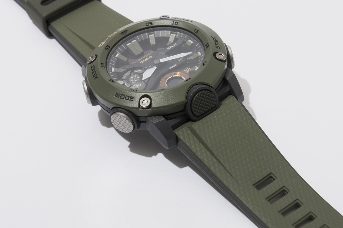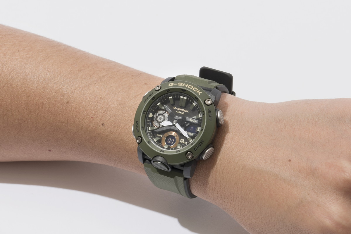 数あるラインナップの中でも、今回は次世代スタンダードを担うシリーズ「GA-2000」の新モデルをピックアップ。カーボンケースでモジュールを保護する新たな耐衝撃構造“カーボンコアガード構造”を採用し、立体文字板や大型フロントボタンで力強い表情に仕上がっています。ミリタリーテイスト溢れるカラーリングで、街使いはもちろんアウトドアシーンにも最適。キャンプやBBQを始め、山や海でのアクティビティも、時計へのダメージを気にせず思いっきり楽しめます!