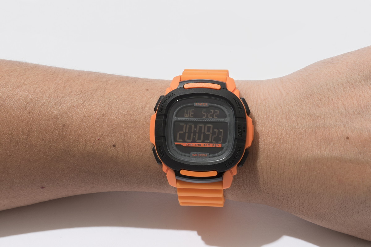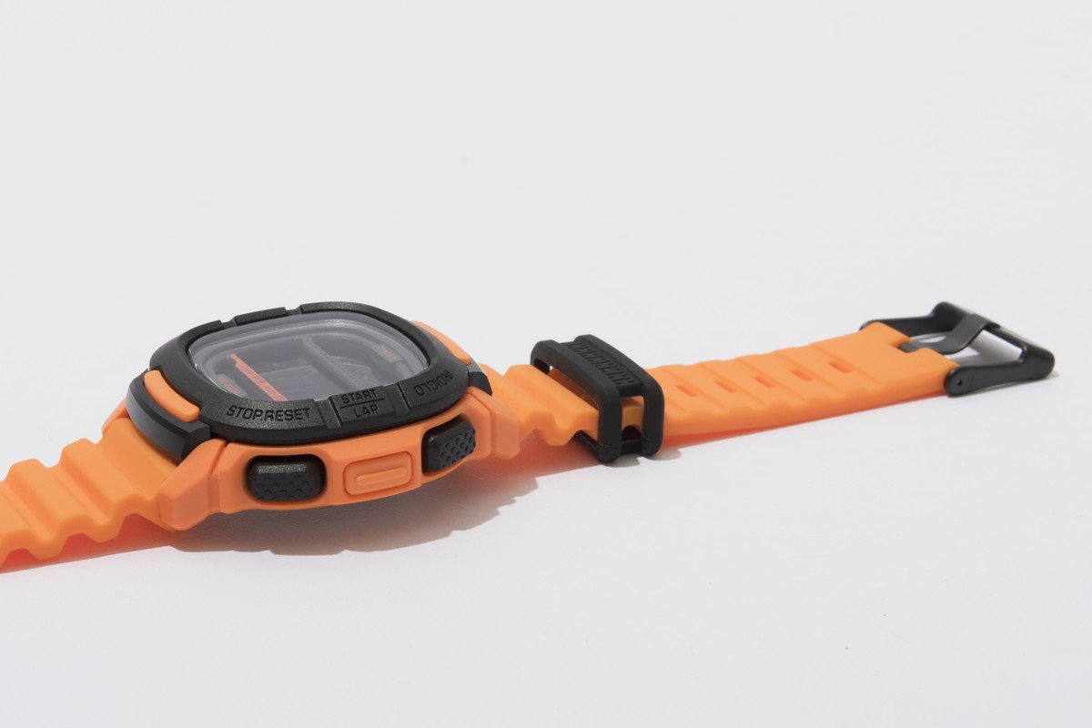 シンプルなイメージの強いタイメックスの時計ですが、新モデルはひと味違います。耐衝撃性を備えた3ピース構造のケースに、シリコンストラップを採用。そのカラーは鮮やかなオレンジで、白Tとの相性が抜群なんです!