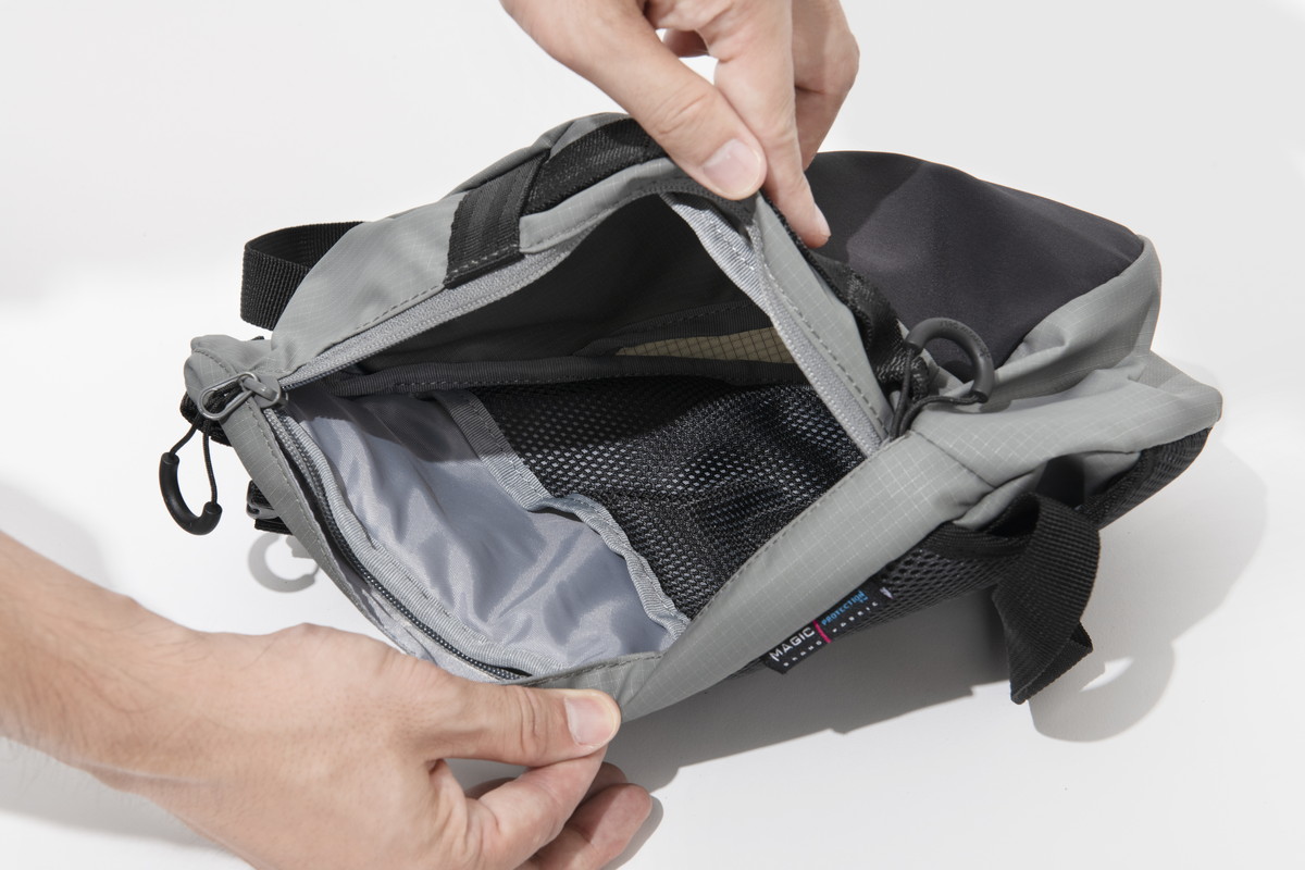 たすき掛けしやすいフォルムが特徴。素材には、軽量で耐水性に優れ、経年劣化の少ない「マジックプロテクション加工」が施されています。ショルダーバッグとして単体で使えるのはもちろん、バックパックのショルダーストラップに取り付けても使用できる2WAY仕様。ハイキングの時にすぐに取り出したい物や貴重品を入れておくのに重宝します。