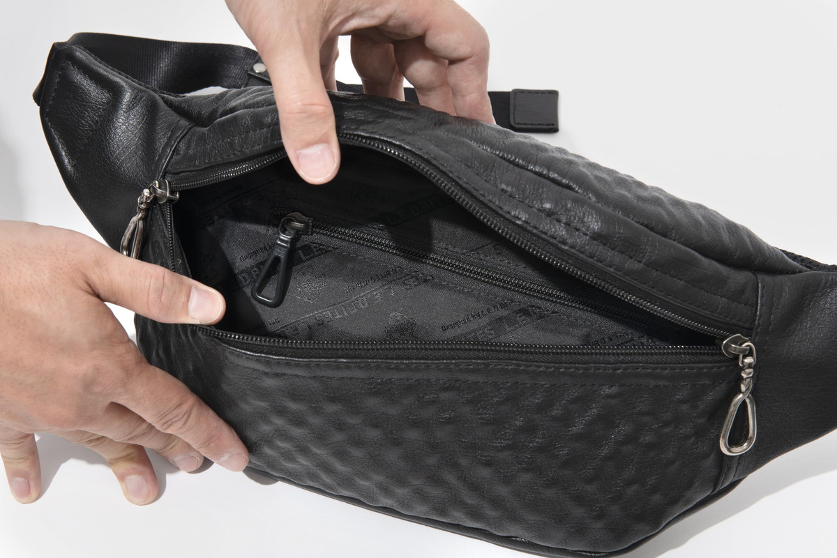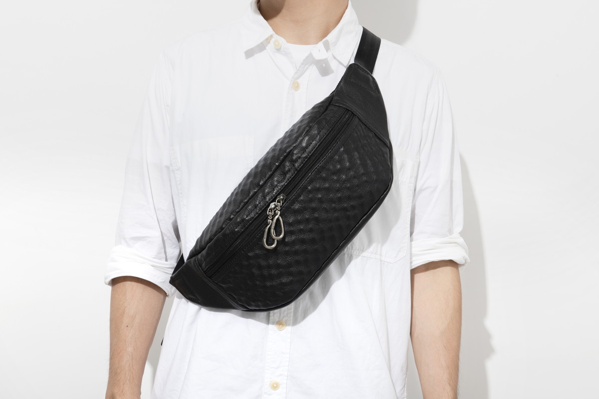 ファスナープルにもこだわったインパクトのある見た目と、レザーの凹凸が生み出すアタリが武骨な雰囲気を創出。デザインが際立ったウエストバッグになっています。また、外ポケットはないものの、コンパートメント内にファスナーポケットがあるなど、収納力も必要十分です。