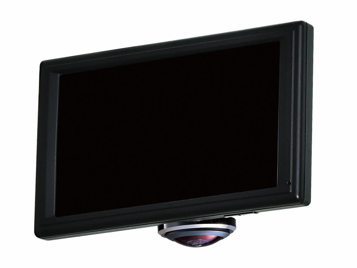 モニターユニットにカメラを組み込んだユニークなデザインが特徴。画面は5インチでタッチパネルディスプレイなので、映像の表示に加えて各種設定操作が行える。オプションカメラ接続で前後撮影モデルへの発展も可能だ。