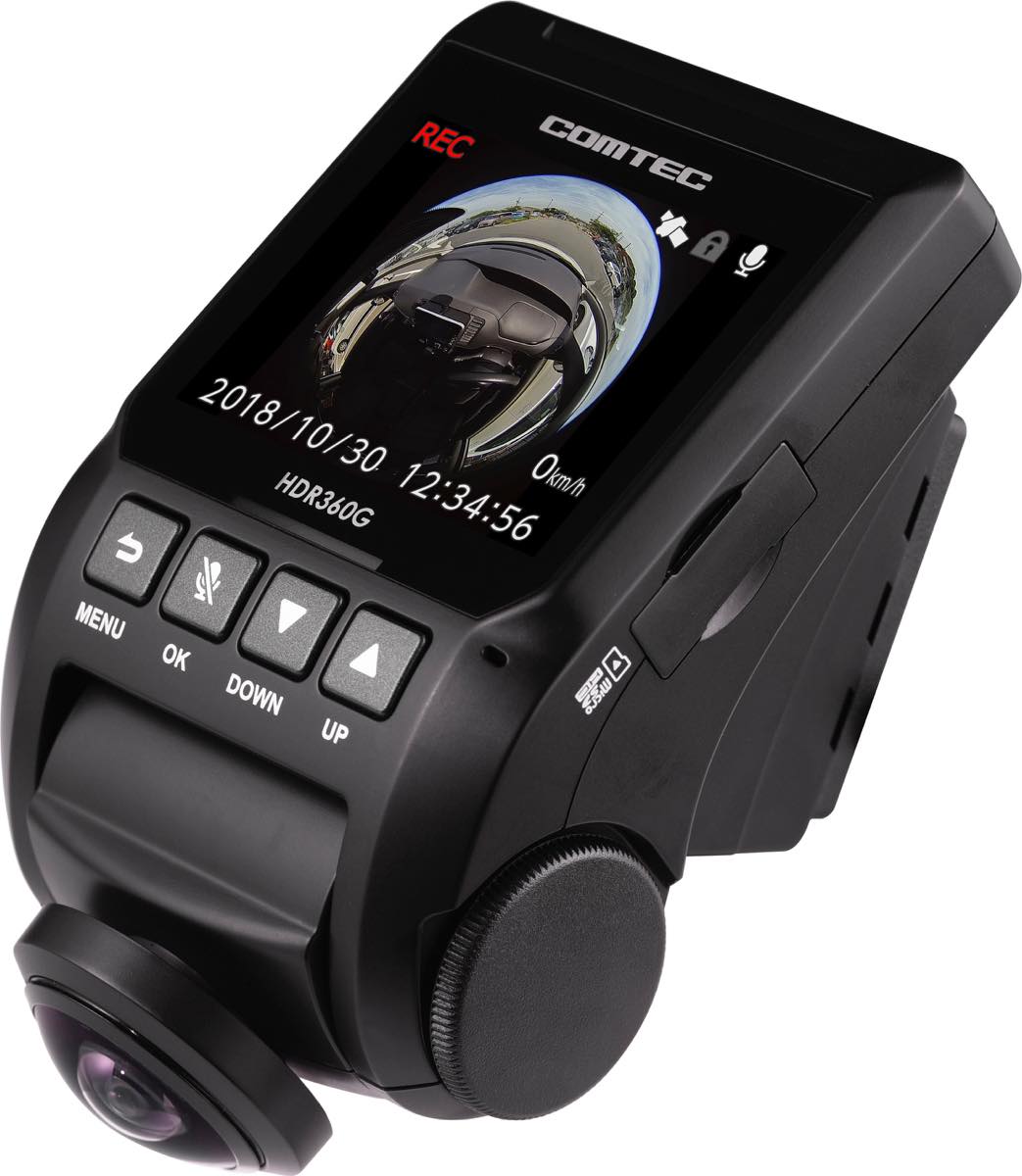 コムテック「HDR360G」は、背面の2.4インチディスプレイと、4つのボタンを使って設定を行う。説明書を見なくても扱えるほどメニューがわかりやすい親切設計だ。操作キーのサイズが大きく、役割がはっきり書かれていて使いやすい。レンズは角度調整可能だが、基本的には真下に向けて使用する。