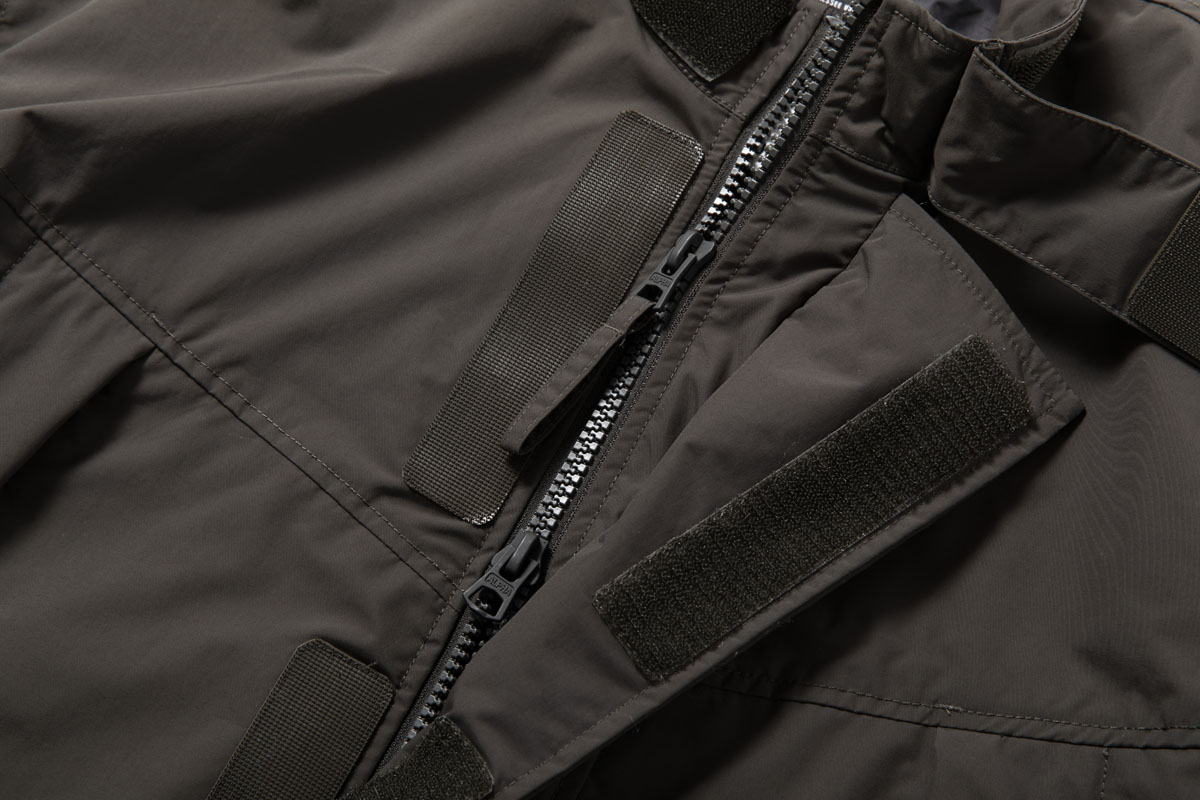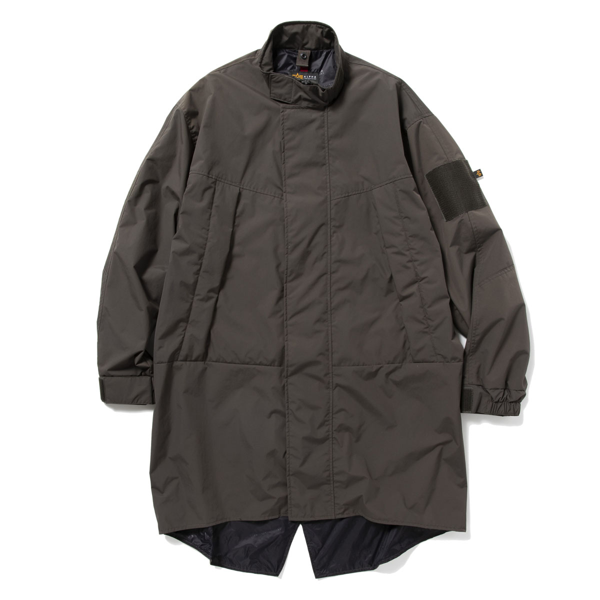 トレードマークであるフィッシュテールデザインはそのままに、首元のフードを省略してスッキリと。さらにボディマテリアルをナイロン素材にチェンジしつつ、各所のファスナーを隠すことでより都会的な表情のミニマルデザインに。裏地には、着脱可能な中綿入りベストを装着。ベストを外せば秋口のライトアウターとして、真冬にはベストを付けて重コートとして着用できる、長期使用可能なお値打ちウエアへと仕上げれらています。