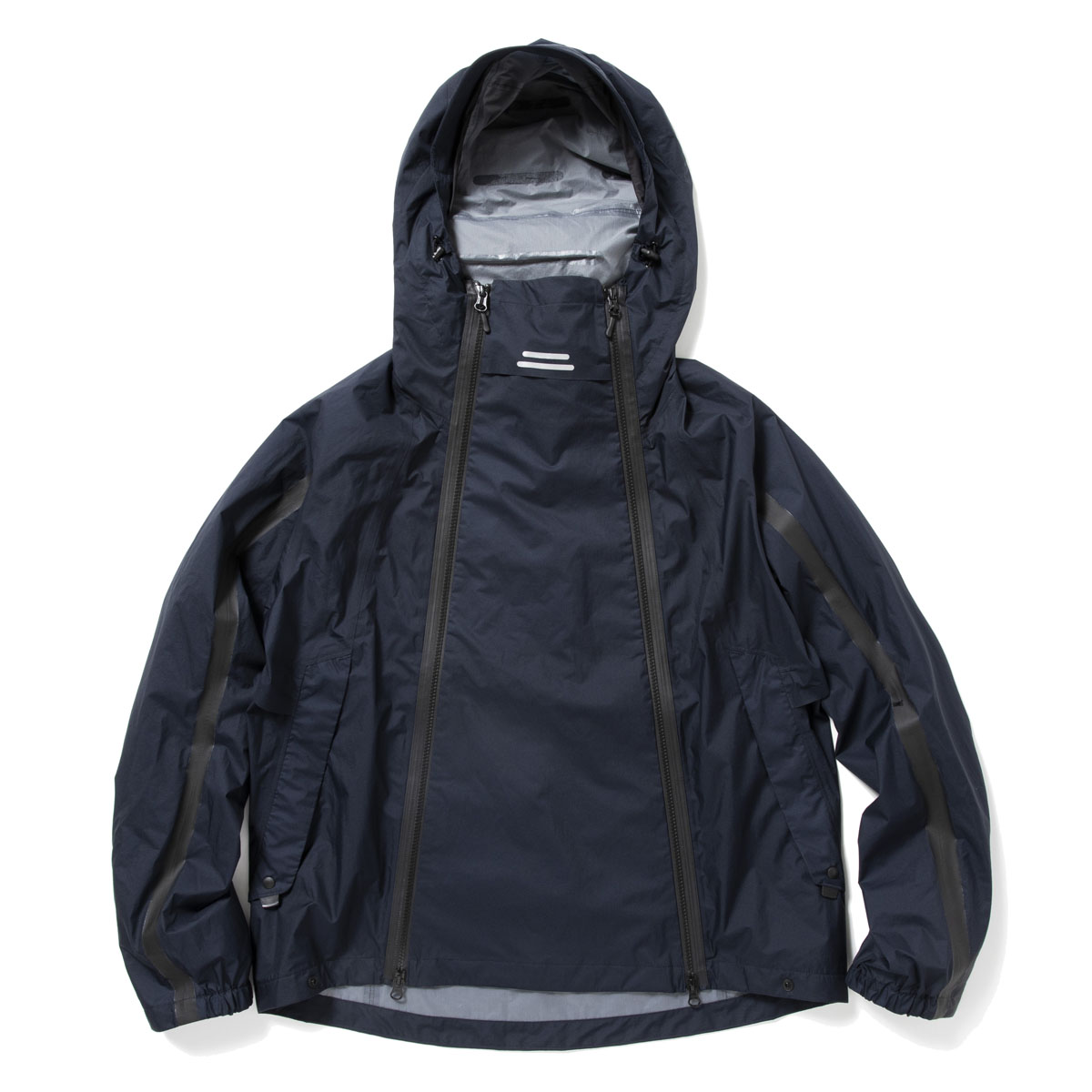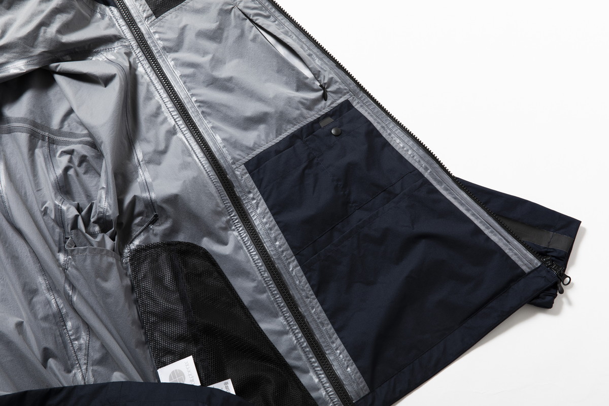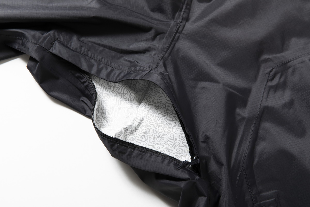 すべての縫製箇所からの浸水を防ぐフルシームテープ仕様やアジャスタブルフード、ストームフラップ、エラスティックカフなど、さまざまな機能的ディテールを搭載。アウトドアでのパフォーマンスシェルとしてはもちろん、タウンユースでのレインジャケットとしても活躍するマルチパーパスな1枚です。脇下にはベンチレーションジップを配置し、雨天時に運動し続けると必然的に増えてしまう衣服内の水蒸気も素早く外に逃がしてくれます。