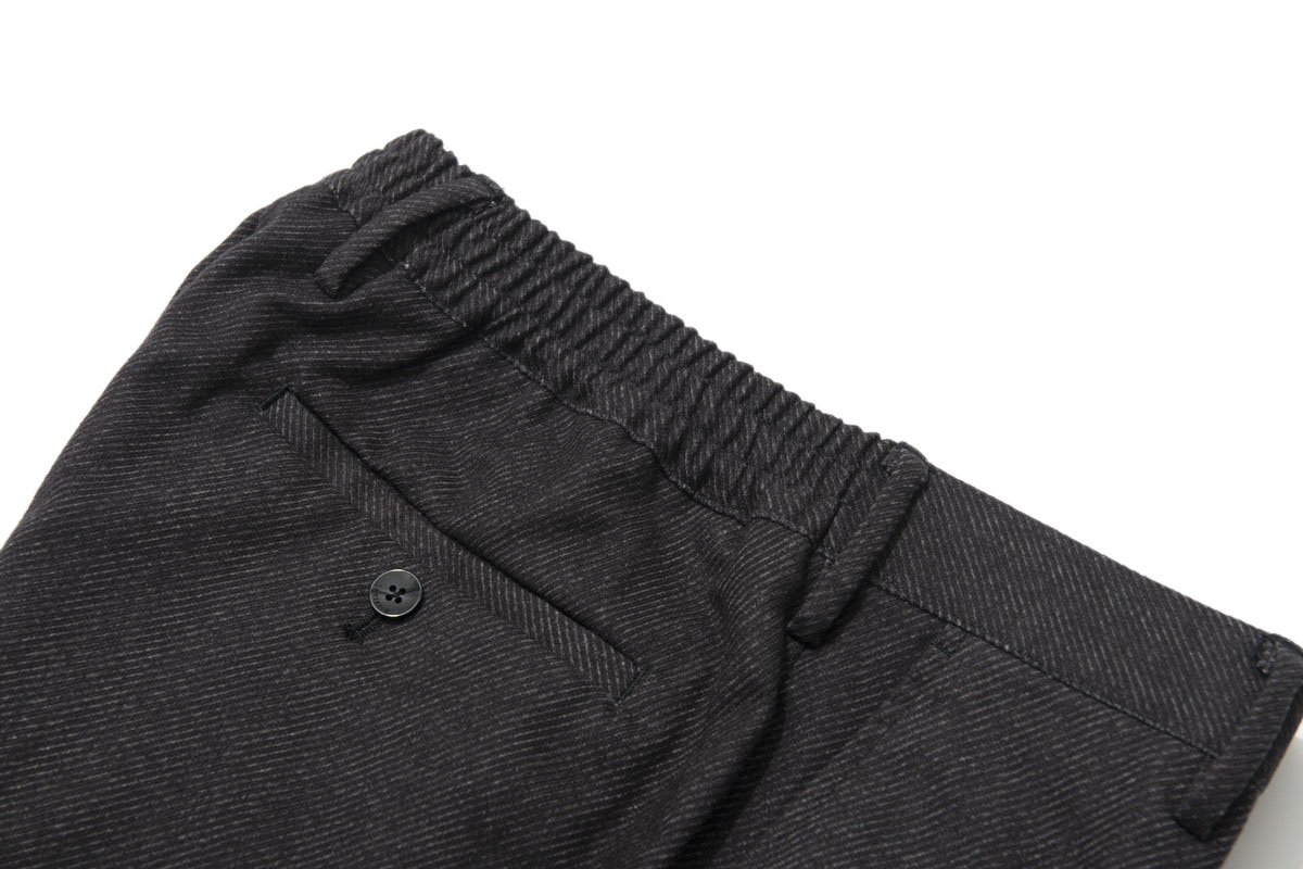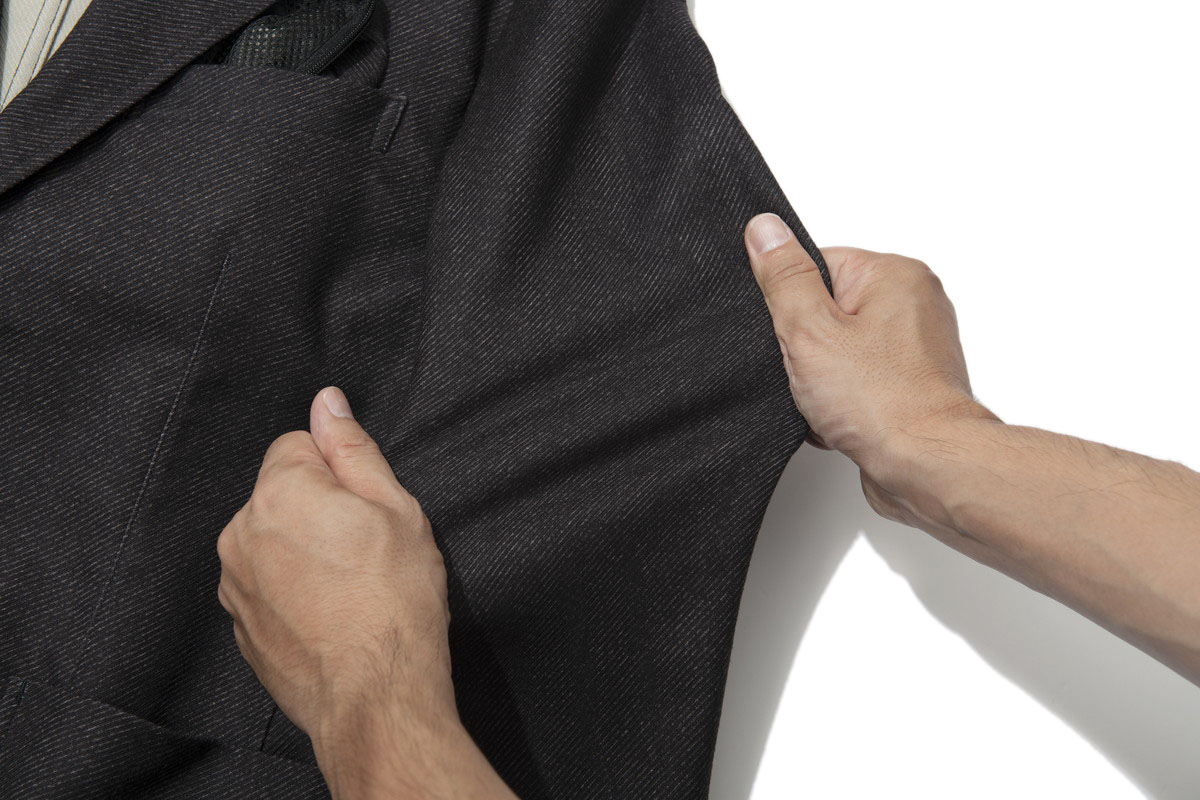 春夏シーズンには、クールマックスやシアサッカー、SUPER 120s ウールなど、さまざまな素材バリエーションで展開された同シリーズ。今回紹介するセットアップには、斜め45度に入った斜文が特徴のダイアゴナルの生地を使い、クラシカルで大人っぽい印象に仕立てています。起毛素材なので秋冬モデルらしい温かみも感じられますね。