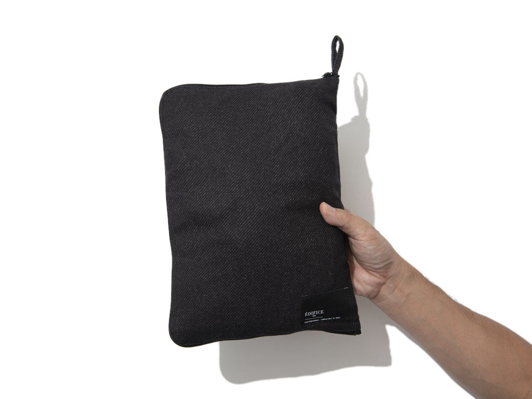 付属のポーチは、片面がスーツと共地で、もう片面がメッシュで作られています。メッシュ側にはファスナーポケットを搭載しているので、ネクタイなどの小物を収納できて便利。