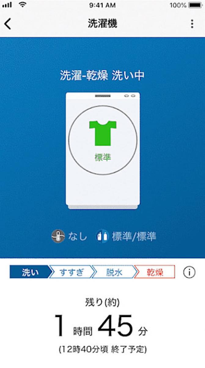 ▲専用のスマホアプリでは、遠隔操作や運転状況の確認が可能。洗濯槽の洗浄時期や洗剤の残量が少なくなった時も通知してくれる