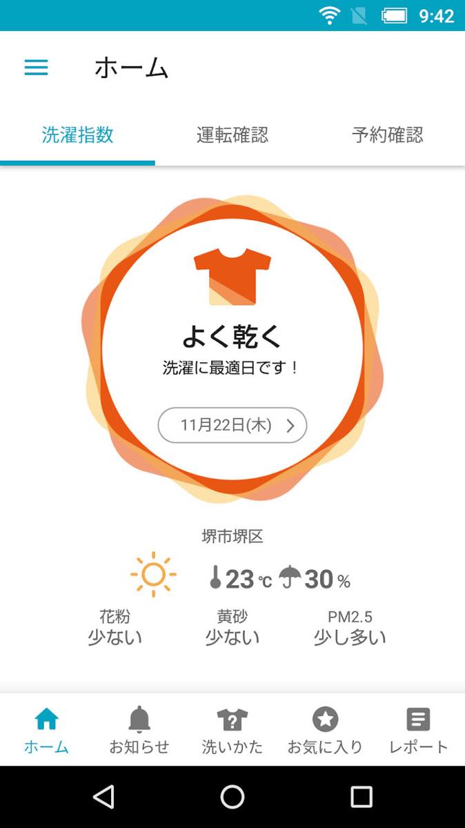 ▲専用アプリでは、運転状況や終了予定時間に加え、天気情報に連動した洗濯アドバイスも確認できる