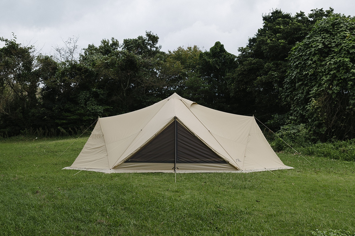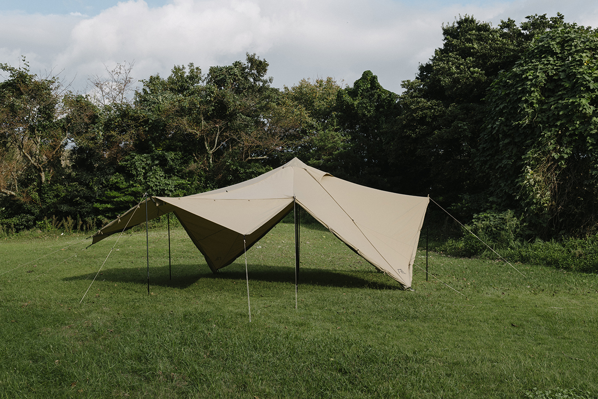 第1弾はシェルターとオープンタープの計4モデル。いずれも根強い人気を持つポリエステルとコットンの混紡素材でナチュラルな質感。そして、張り方のバリエーションが豊富なのが特徴です。中でも注目は「スカイパイロット TC」。