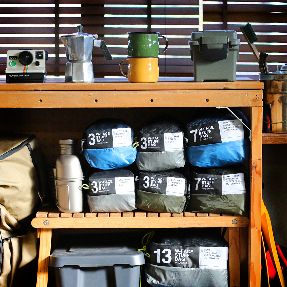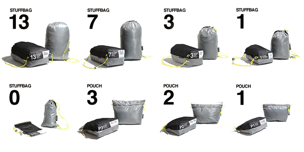 商品名の前の数字は、容量(L)を表しています。巾着タイプのSTUFF BAGとファスナーで閉じられるPOUCHで、どちらもほどよいマチ付き。これらはいろいろな道具を採寸し、無駄なく収まるサイズを計算したそう。