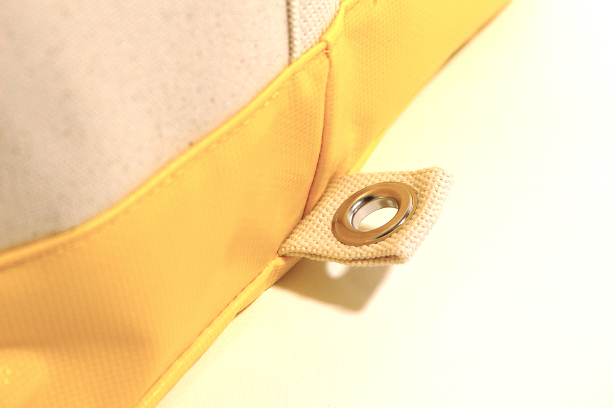 底とフチはターポリン製で、地面に置いても大丈夫。ペグで固定できるハトメ付きなのも気が利いています。