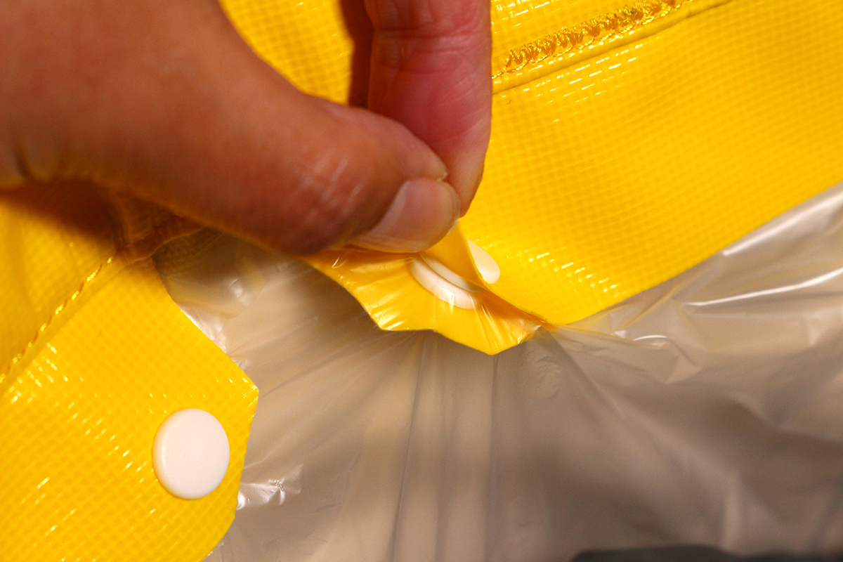 ルー・ガービッジならではの、ビニール袋を固定するスナップ付き。ゴミ箱としても使えますし、これだけ大きなサイズなので雨に濡れたタープも入りますし、薪を入れたり、寝袋やブランケットの収納にもよさそう。これからの季節は汚れた長靴や濡れたスキーウエアを入れて持ち帰るなんてことも可能です。