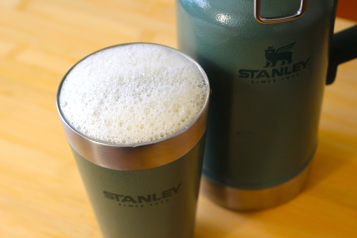 缶ビール500mlを入れて3時間後、タンブラーに注ぐとこの通り。ビールはなるべくいっぱいまで注いでおくほうが炭酸が抜けにくいので、容量1Lのグロウラーに500mLのみ入れるのはかなり不利です。にも関わらずこの通り、しっかり泡が立ちました。