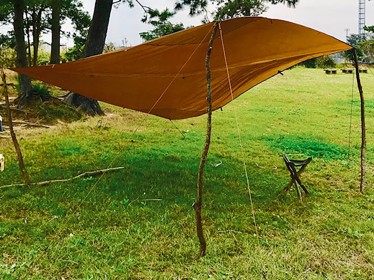 キャンプ場にはポールに使えそうな硬めで長い枝が落ちていることもありますが、大抵の場合は片付けられるか、落ちていてもボロボロに弱くなっています。こちらはよく乾かした硬い広葉樹を使用。小型タープなら問題なく支えてくれるそうです。