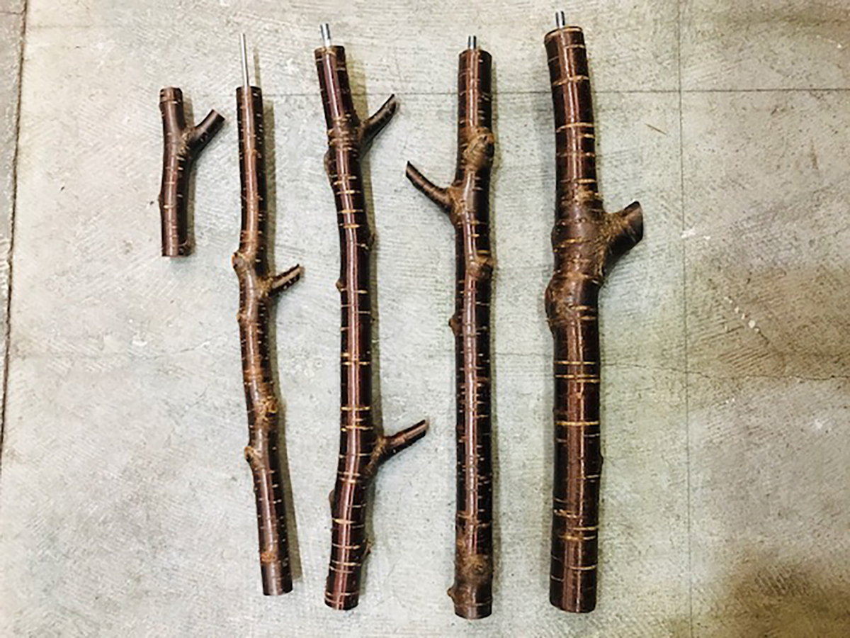 原木は桜や栗、カエデ、ナラなどの広葉樹。1本1本、雰囲気が違ってそれがステキ。枝のもとの皮目が合うようにつながっています。樹種や形状が1本ずつ異なるので、その枝にあった加工を施しているそうで手間がスゴイ。