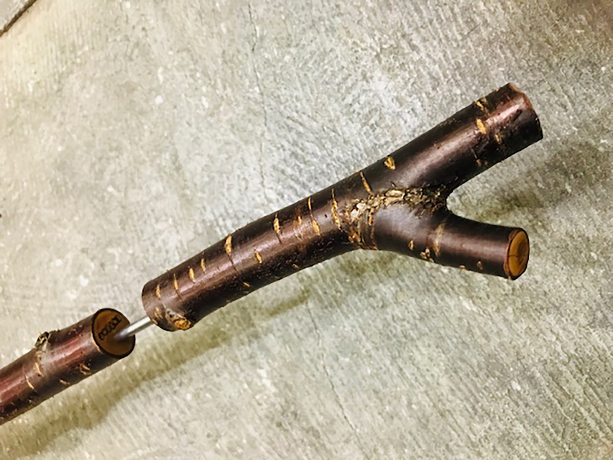 エントホが作った「タープポール」は、自然が作った造形美、枝の姿をそのまま残したポールです。それもそのはず、1本(185cm)の枝を4等分に切り分けて持ち運べるに加工しているのですから。