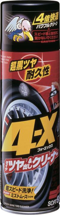タイヤ側面にスプレーすると、スーパーミストムースが汚れを素早く落としてくれる。2種類の高粘度シリコーン樹脂が密着し、長期間汚れの付着を防止。ツヤも出る。
