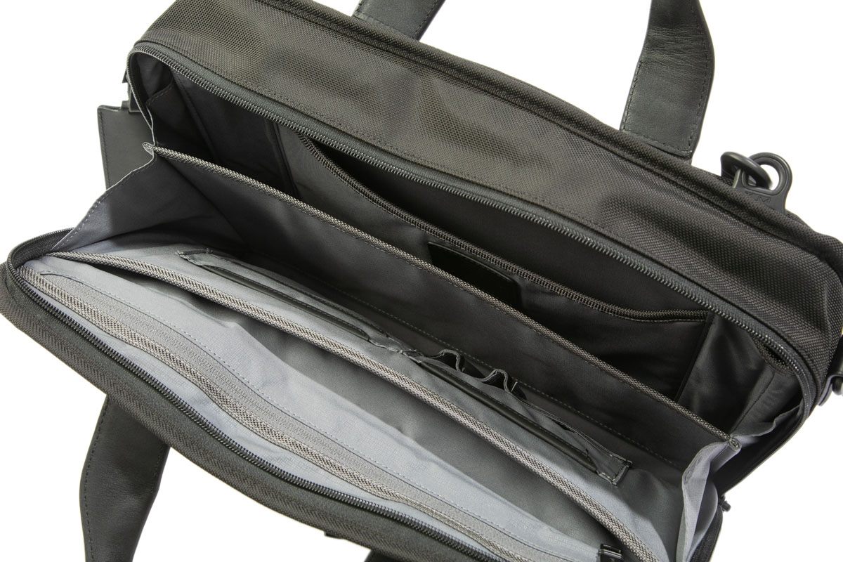 そんなトゥミの代表格“アルファコレクション”の「スリム・スリーウェイ・ブリーフ」は、さまざまなシーンに対応できる柔軟性と、トゥミの誇る機能が一体化された3WAYバッグです。手持ちでブリーフとして、通勤時には本体に格納されたストラップを出してバックパックとして。そして肩への負担を軽減する特許取得のショルダーストラップでショルダーバッグとしても使えます。