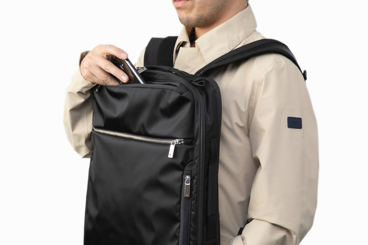 シンプルでスリムなボディからは想像もつかない機能性と収納力をもち、自転車通勤や徒歩通勤はもちろん、電車での通勤でこそ、その機能を実感できるバッグといえます。